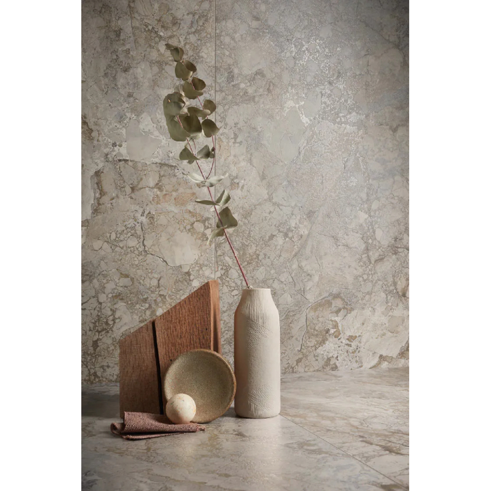 The texture of breccia marble powerfully comes alive in the Walnut shade and creates a sharp contrast with the wooden furniture featuring clean lines. Warmth and cold, smoothness and waviness, blend together in an ambience where naturalness and design reign supreme.