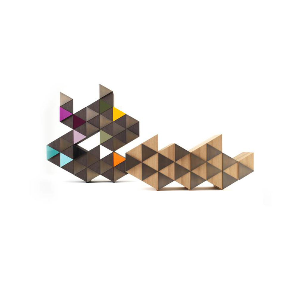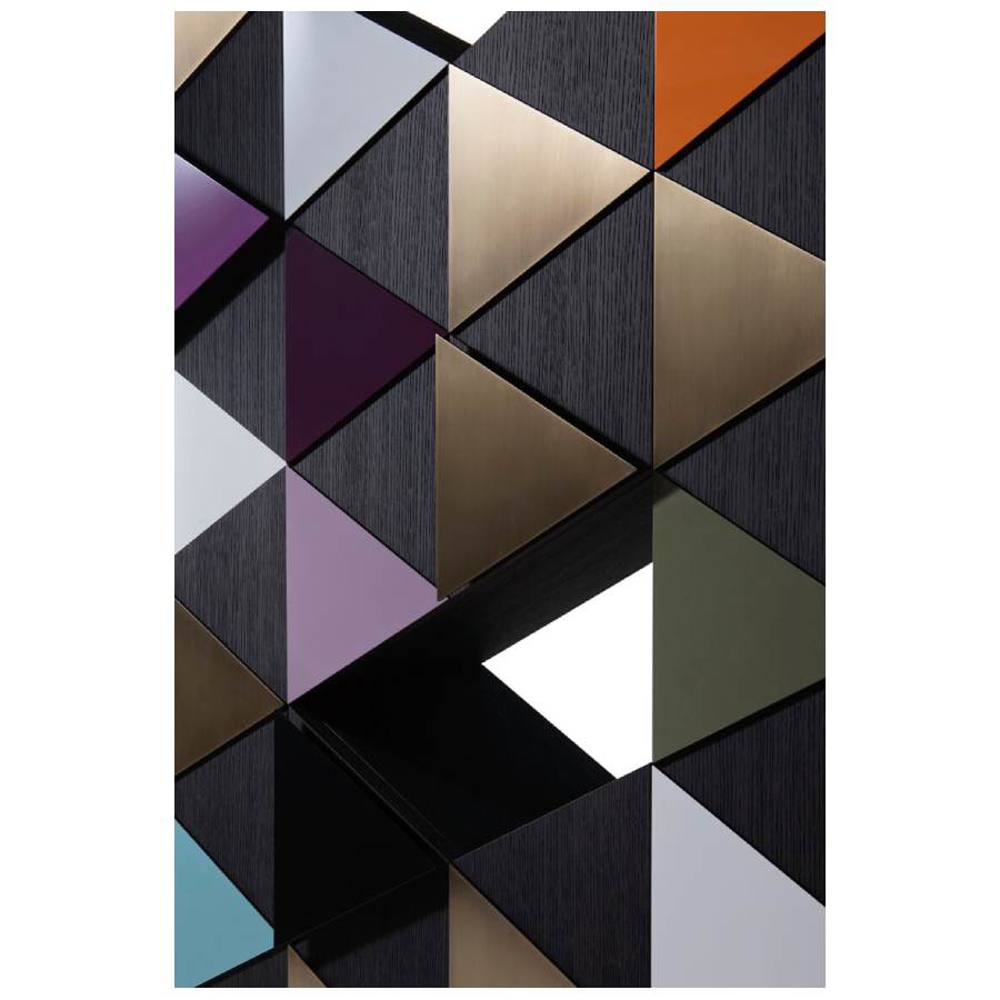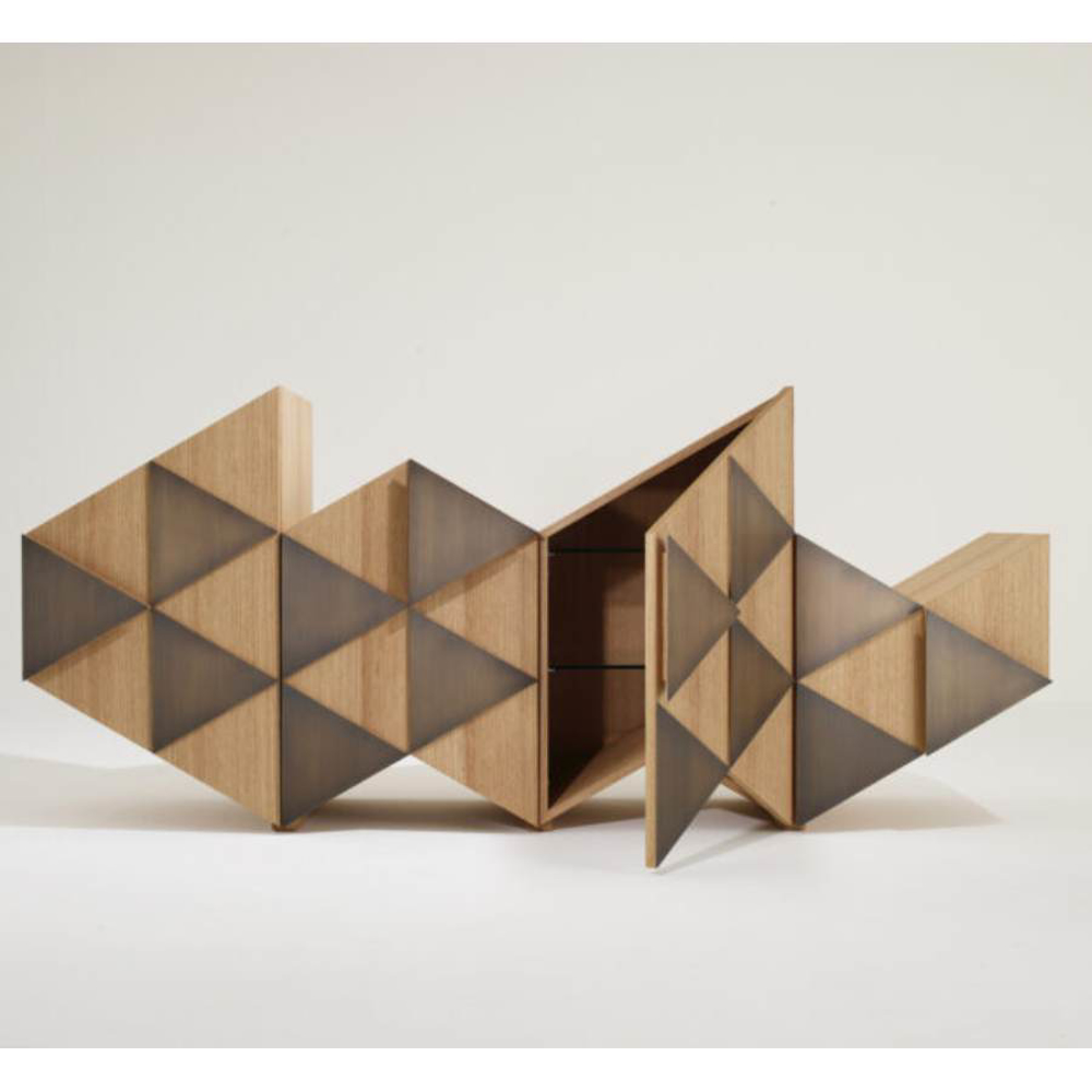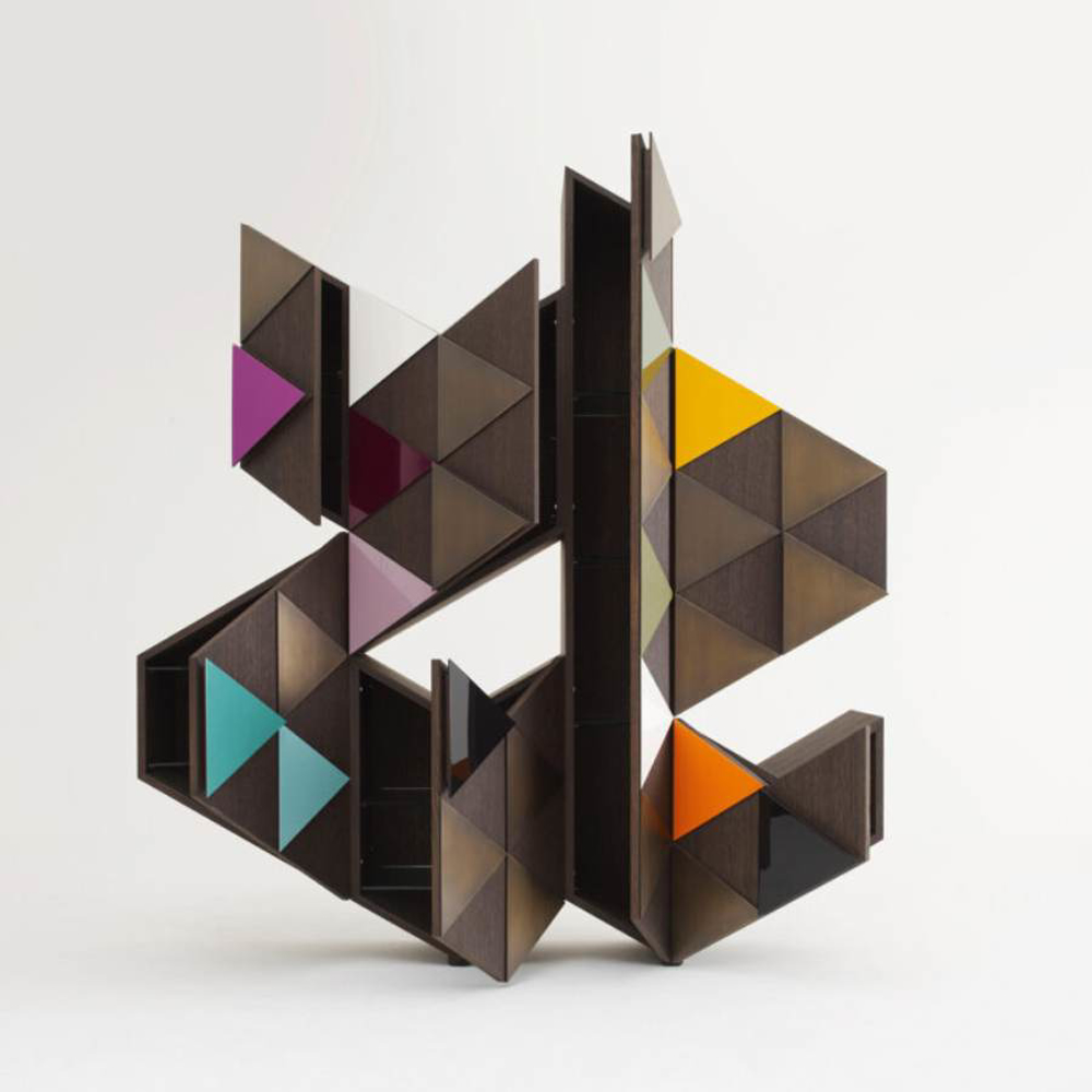 Its doors are decorated with differently finished triangles and hide containers of different sizes and shapes that follow the frontal geometries.