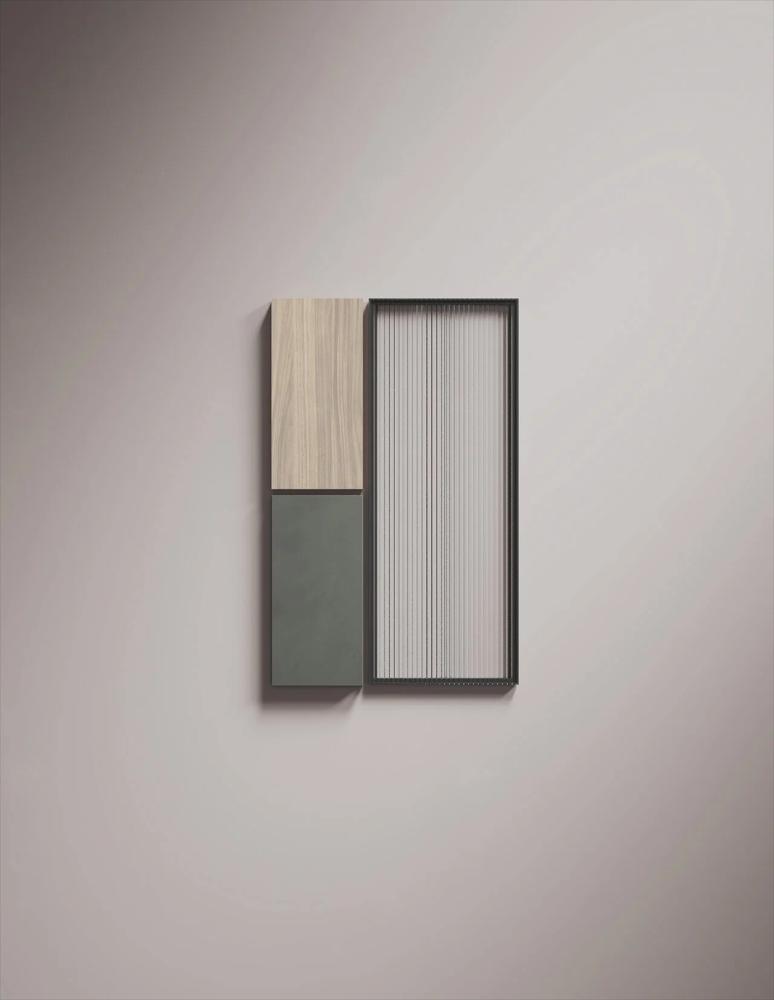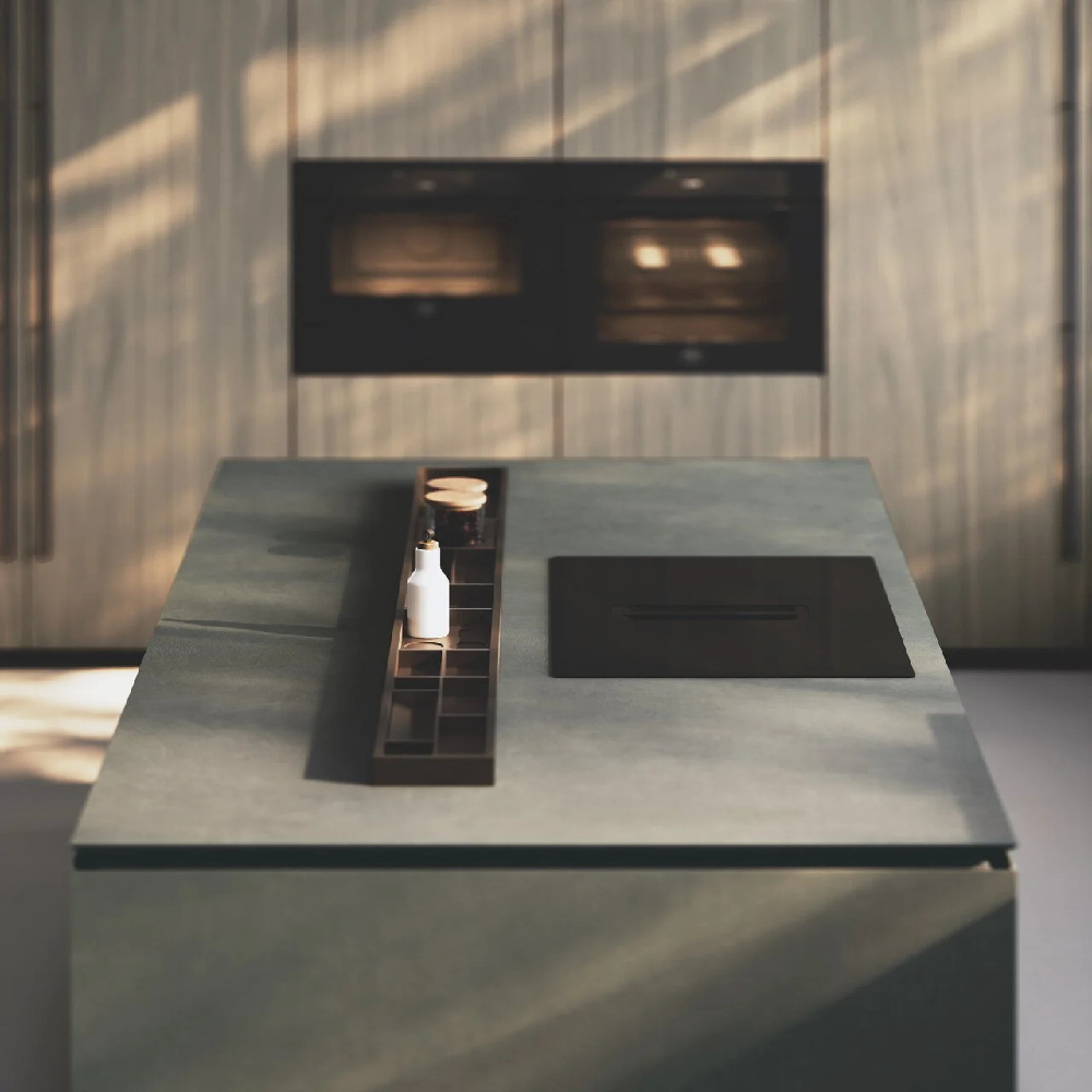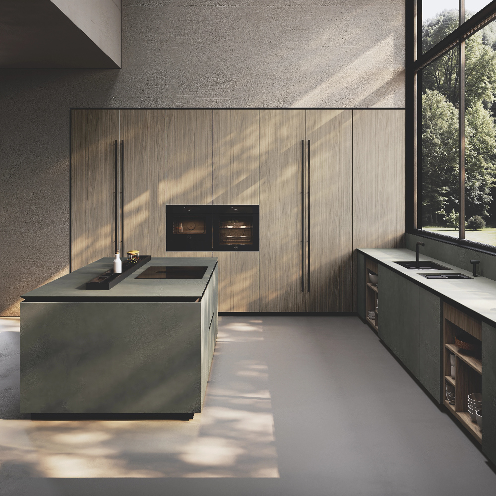 Wall-mounted columns in Noce Salina wood bilaminate, with vertical Libra handles in black finish. In the center, the Balance island features a 45˚ profile in Chester Green finish, with Emme groove opening. The worktop, with Mini Slide profile, is in Balance Chester Green Nat stone (porcelain).