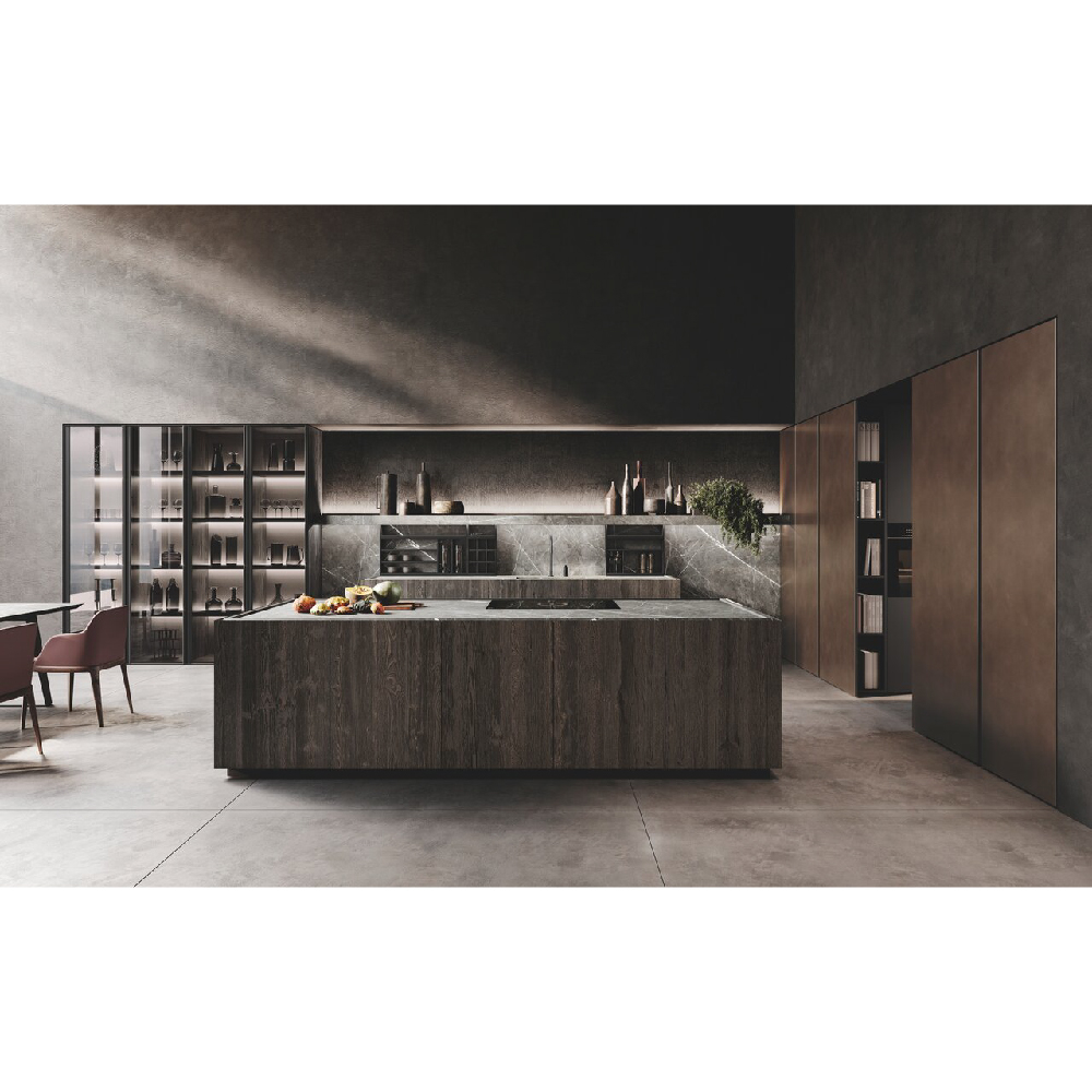 A project that allows to rediscover the pleasure of living a rich and warm kitchen environment. A truly professionally inspired laboratory with all the accessories and equipment useful for the preparation of food, as well as details of a refi ned decorative product which further enlarges the already vast offer of exclusive worktops on the part of Binova. The matericity of natural wood for a pleasant aesthetic and tactile sensation, column doors in tech aluminum finish are matched with base and wall units in oak wood Rovere carbone finish, a set of high-tech materials, which contribute to creating a unique product of its kind. A large peninsula acts as a watershed between the column area and the living area. The whole project is centered on the theme of specular openings, if the kitchen has a central wooden boiserie, the columns have a central compartment suitable for containment of small appliances and finally the living wall show at the center glass units and wooden back panels.