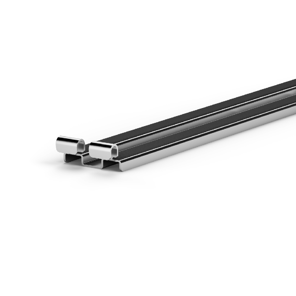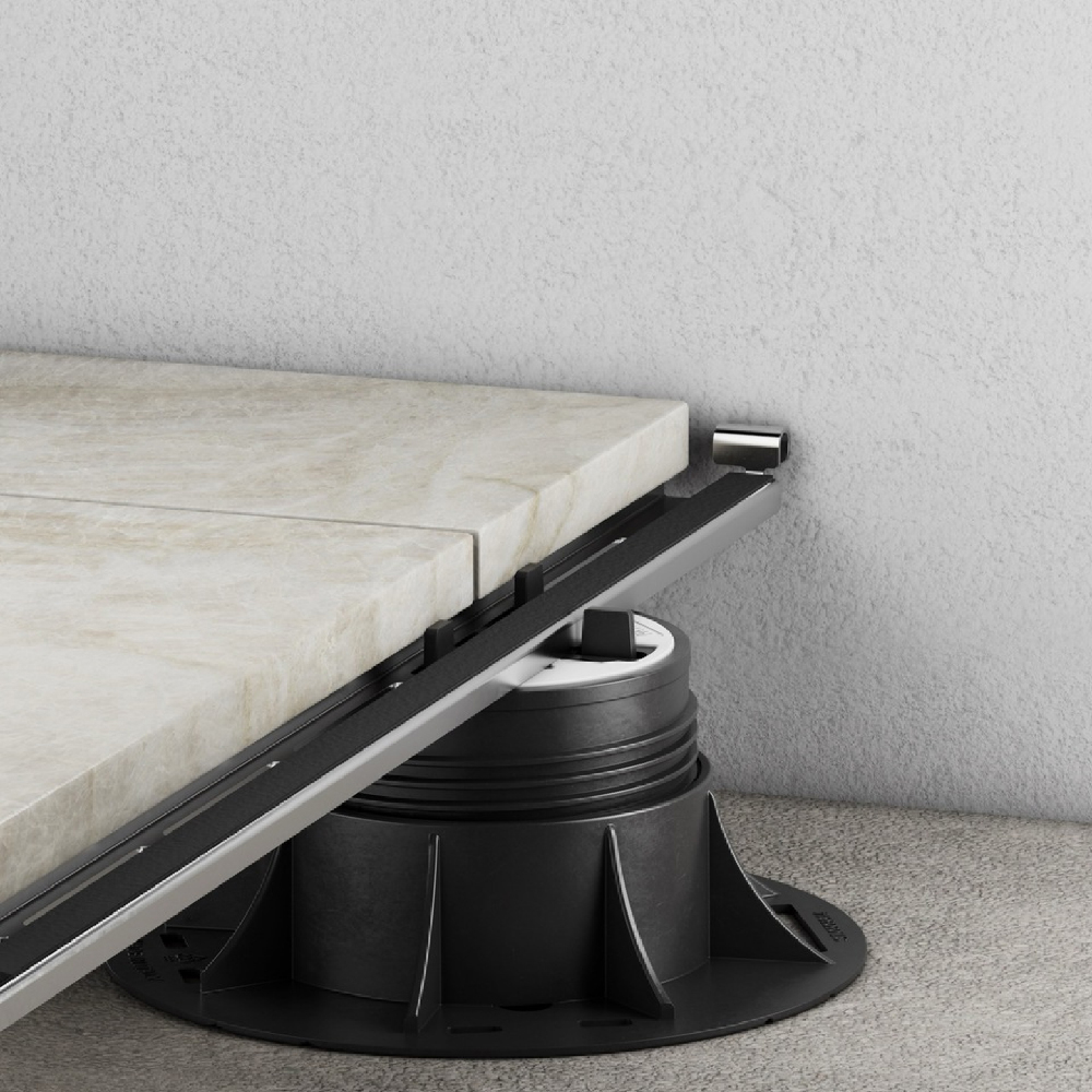 In section, the spacer has grooves for housing the fins and is supplied with a 2/5″ rubber grommet already applied to the surface rails. Thanks to its special shape, it acts both as a plate block and as a perimeter spacer, creating a 2/5″ gap from the wall. It is also equipped with ferritories to facilitate water drainage.