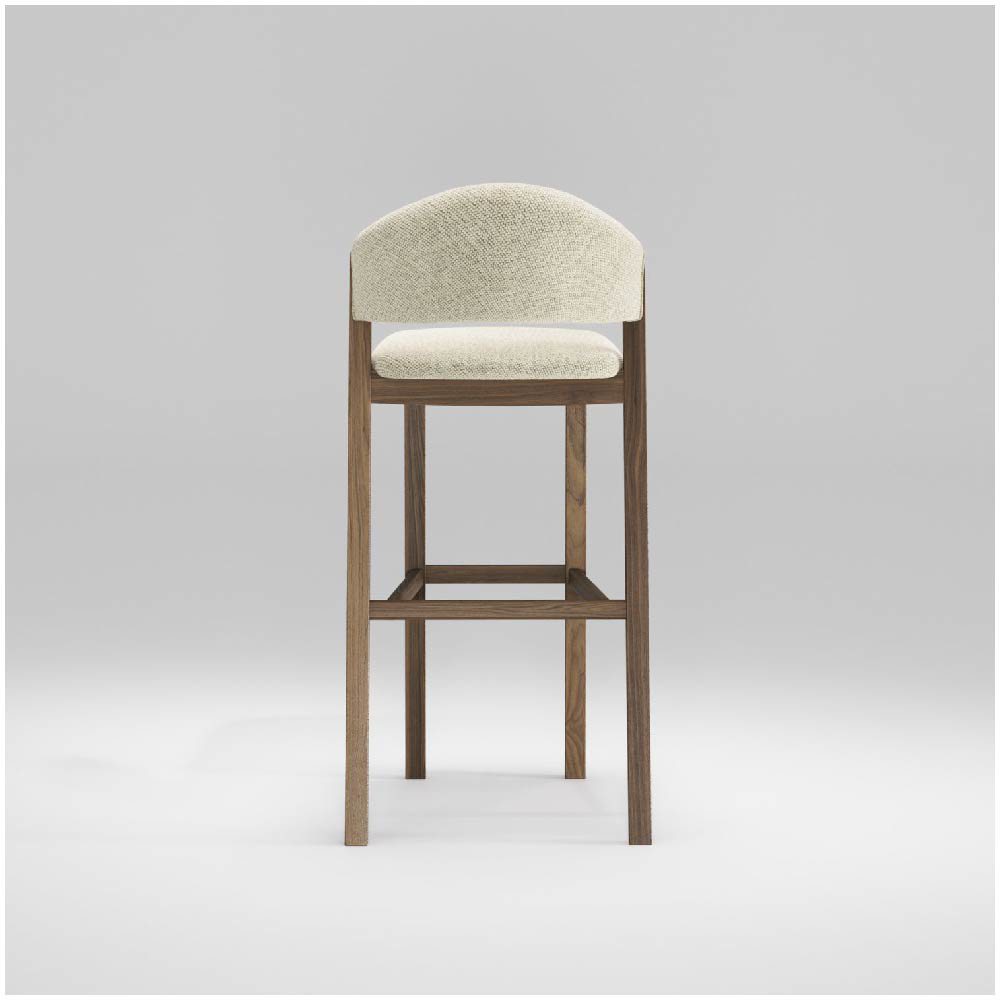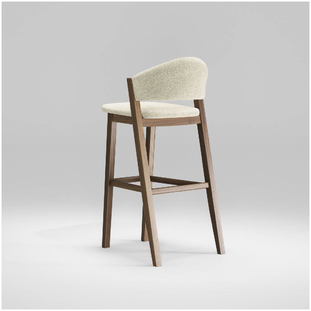 Its silhouette is defined by subtle curves that evoke the fluidity of sails in the wind, while the solid wood structure brings to mind the sturdiness of a ship’s hull. The footrest, carefully integrated into the design, offers comfort and support while enhancing the stool’s architectural balance.