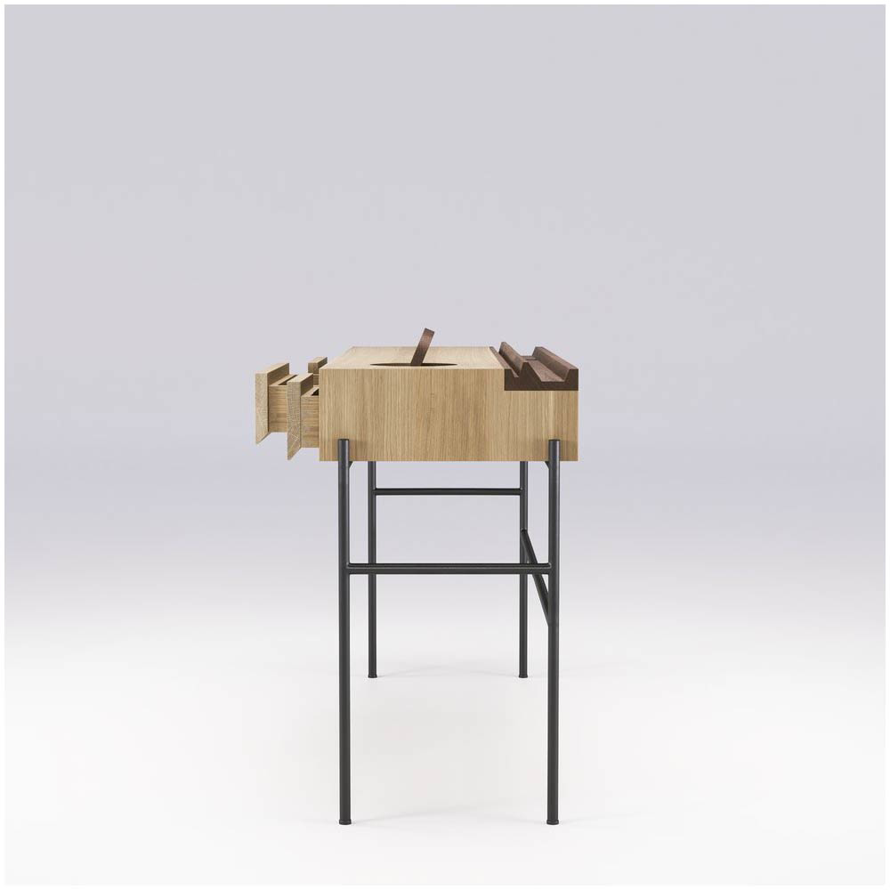 Its top features a practical storage solution with several compartments designed for ultimate organization. These include three drawers for discreet storage of smaller items, a round lid compartment to neatly collect any items left on the surface, and a shaped strip in solid walnut with supporting grooves to display books, magazines, or other cherished items. This thoughtful layout ensures that everything has its place, keeping your space tidy and functional while still allowing for a touch of personal flair.