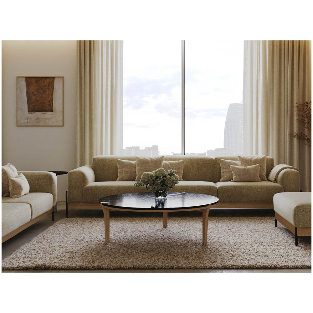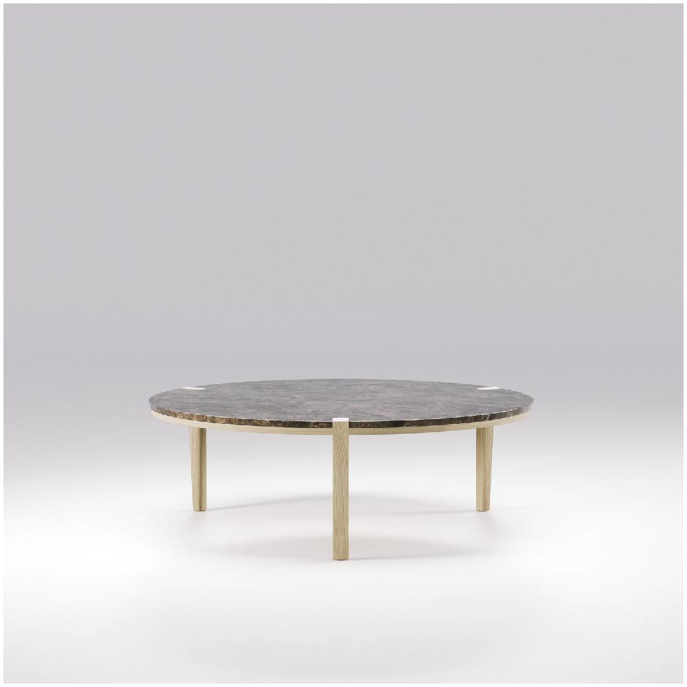 A key feature of the Corner tables is the meticulous assembly detail that can be found in both its rectangular and round versions. This connection between the foot and the top of the table accentuates the contrast between the smooth, polished marble and the solid wood, highlighting the craftsmanship and structural integrity of the piece. The blending of these materials adds a rich texture to the design, creating a striking visual contrast that enhances its overall elegance and presence.