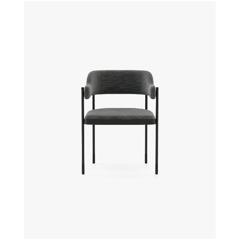 The Dale chair is a stunning seating piece that combines contrasting materials and geometric forms for a bold and functional design. With a convex back and armrest, a metal structure and feet, and a smooth fabric seat and backrest, it is perfect for bold dining rooms or other open settings.