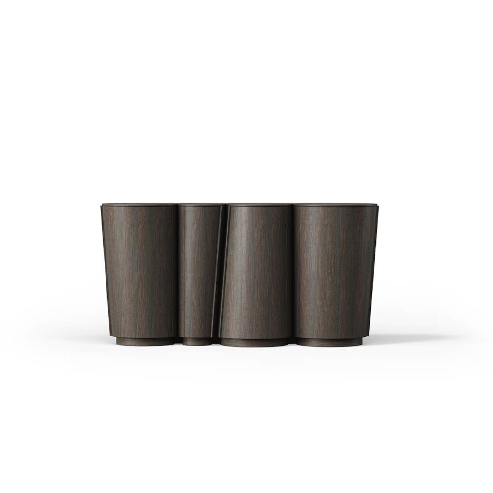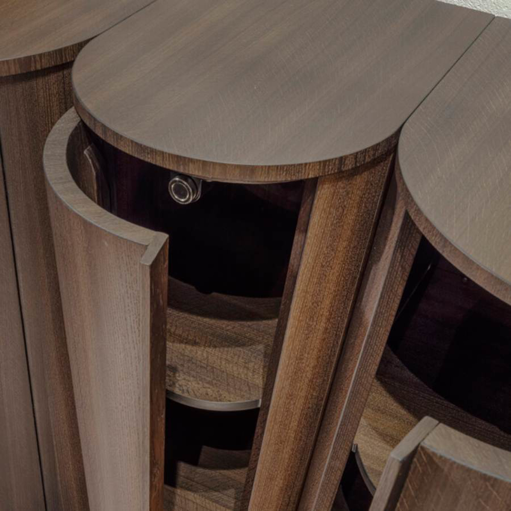 The doors are in fact made of veneered curved plywood and are designed to appear as one with the rest of the structure that makes up the piece of furniture.