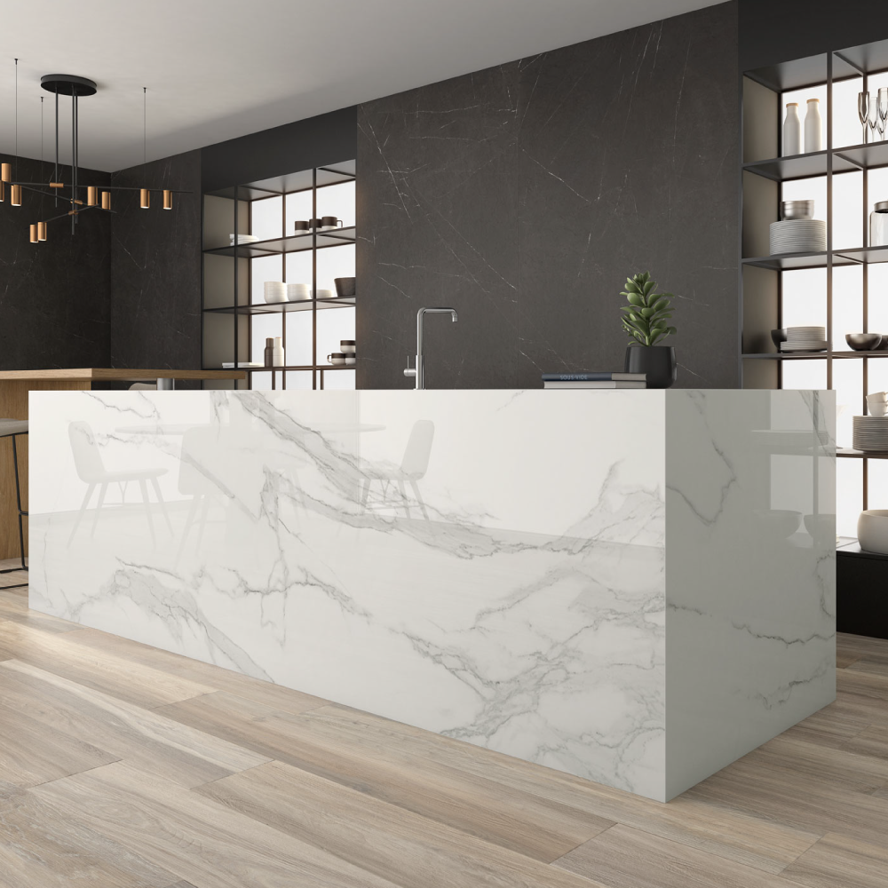 Marblessa Countertops collection is a new sintered mass that provides solutions for kitchen countertop with character and personality. Born as a result of a deep study of decorative trends and the most contemporary demands. Its large dimensions 63"x126", and the extremely high-performance technical features make it an ideal material for the most demanding product applications such as kitchen countertops.