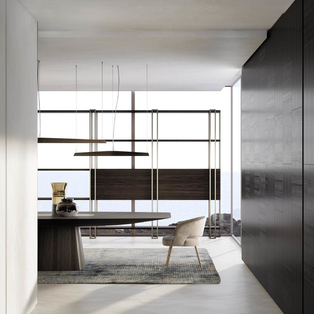 Evan is an extremely particular and slender table, characterized by taut lines that meet soft and pleasant volumes. With its modern shape, it is formed by a monolithic central base and a top embellished with a metal insert on its surface.