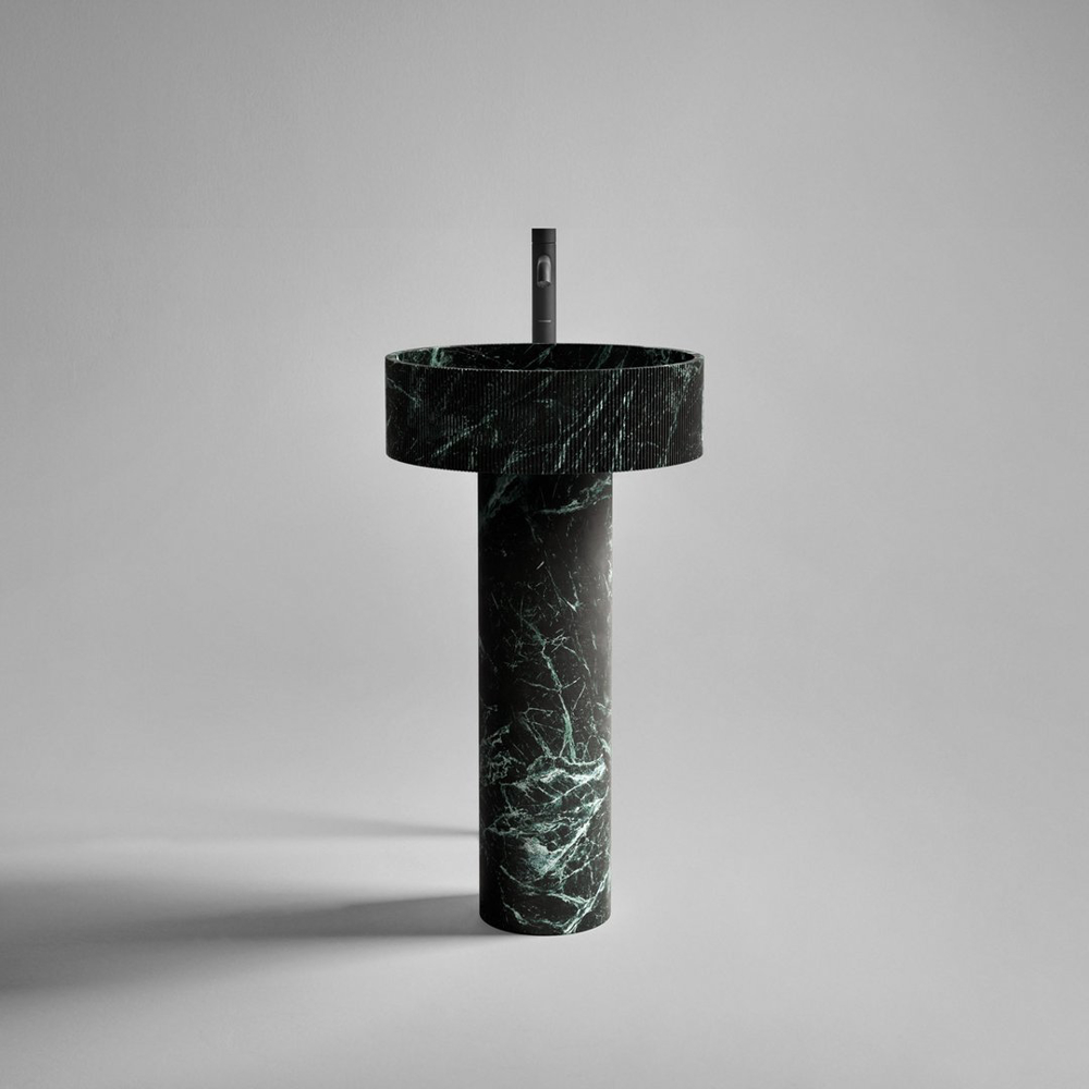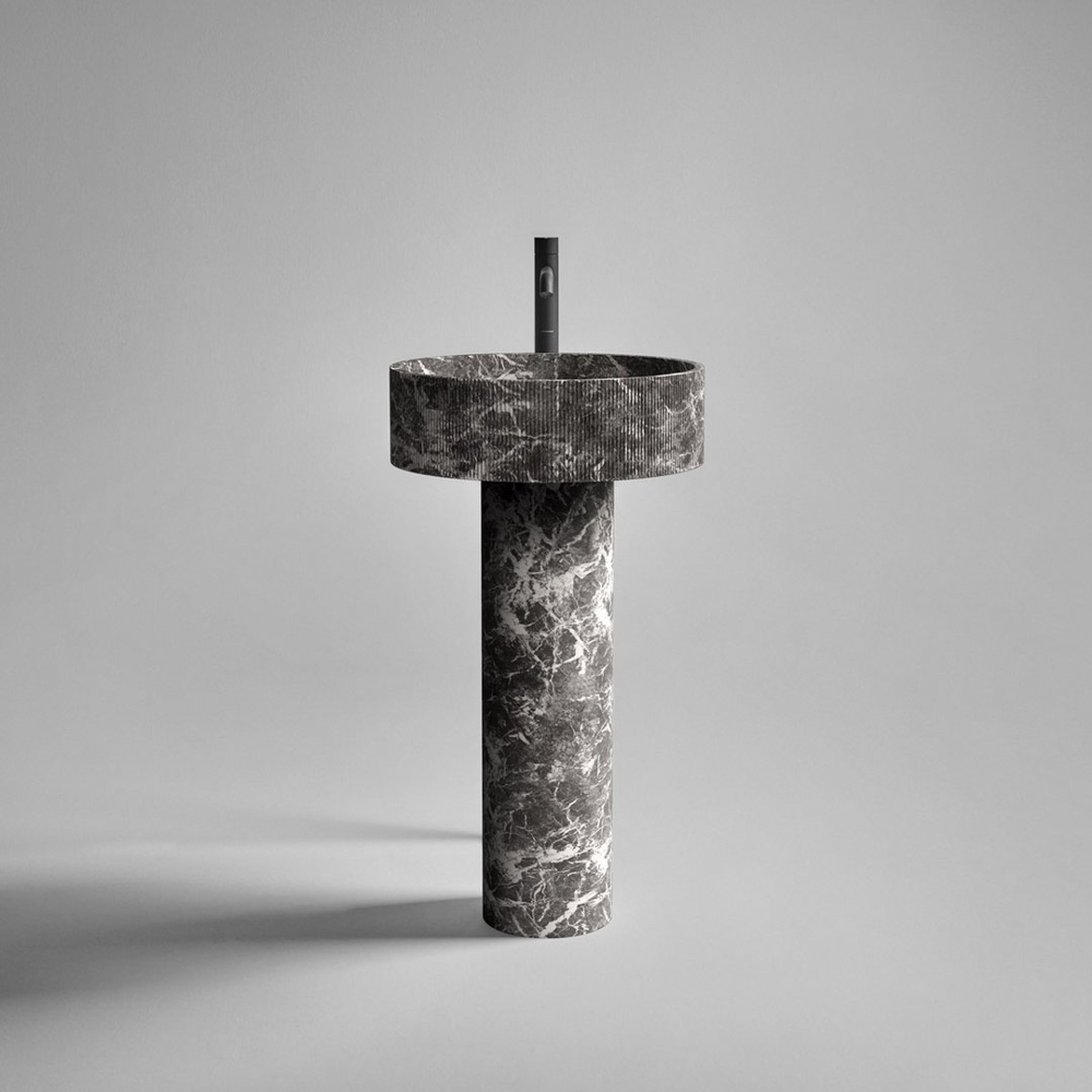 A simplified variant of the Flow sink. An alternative that is more focused on usability while still keeping its unaltered characteristics of simplicity and essence. Composed of a balanced combination of two cylindrical volumes in marble or stone: the slender central column with a polished finish and the basin marked by dense vertical grooves that make its surface vibrant. Also available with integrated lighting.