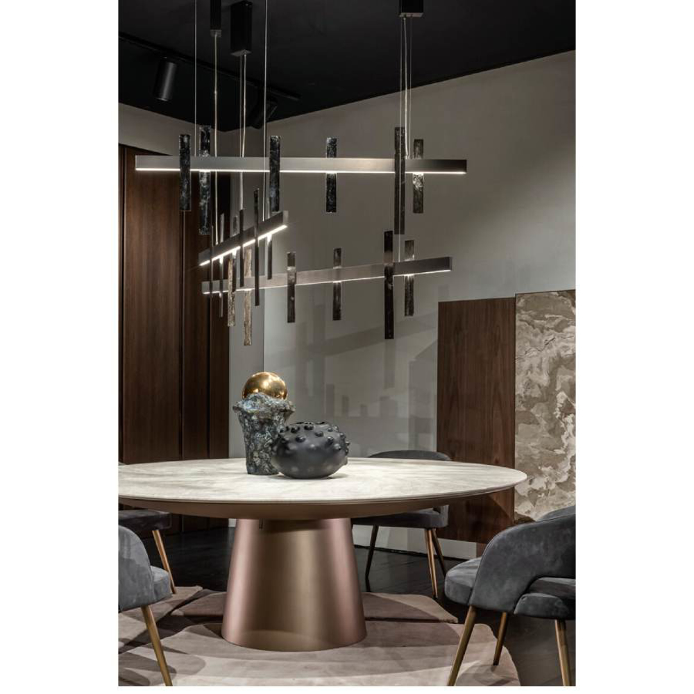 The sun filtered through the branches of a magnificent forest. Games of light and shadows that create magical and sophisticated atmospheres. This is the image that inspired Forest Light, a suspension lamp whose cast metal inserts make the object unique and precious.
