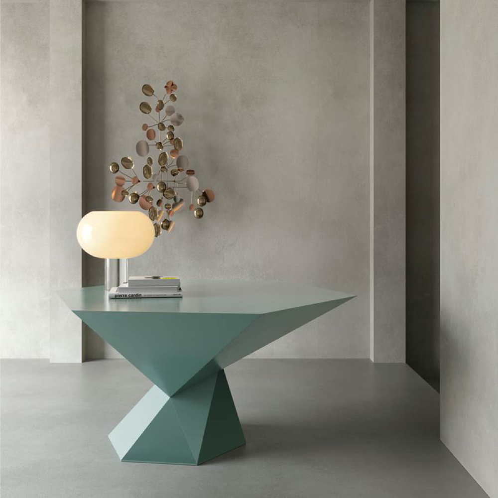 The top can be hexagonal or octagonal in shape. And these geometries are well enhanced by the possibility of making the table in faceted shaped plywood and covered in wood or lacquered.