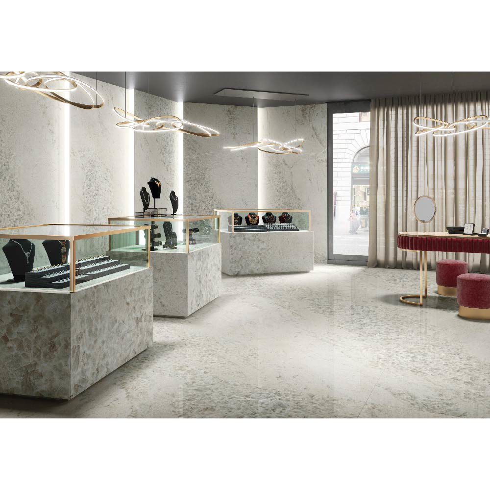 Available in sizes from 120” ×60” to 30” ×15”, Gemstone comes in a polished finish that enhances the elegant chromatic interplay and the three-dimensionality of its texture.
