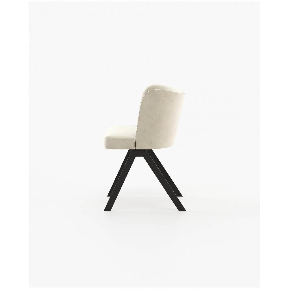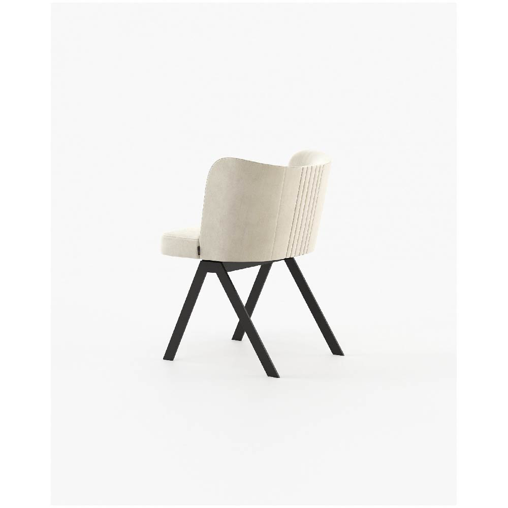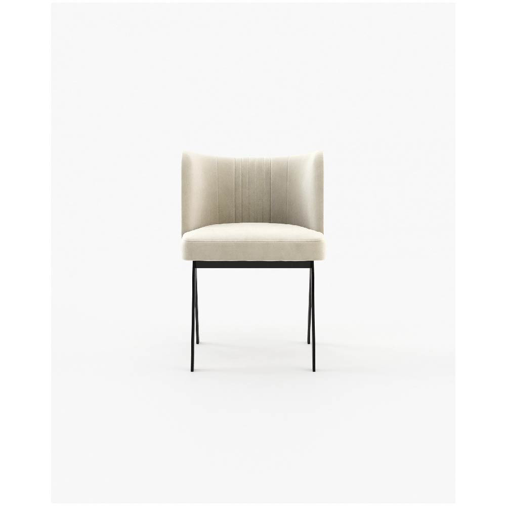 Gordon chair has a strong presence balanced with the beautiful contrast given by the stripes on the back. Upholstered by Laskasas' artisans, it features four shimmering legs for full support. Gordon blends grandiosity and beauty to make a statement in any dining room.