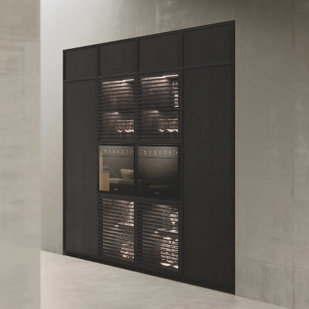 Detail of oven columns with Zen doors in lacquered matt open pore Nero Traffico and smoked glass, internal structure bilaminate wood Rovere Black. Technical side columns with Hily doors in lacquered matt open pore Nero Traffico.