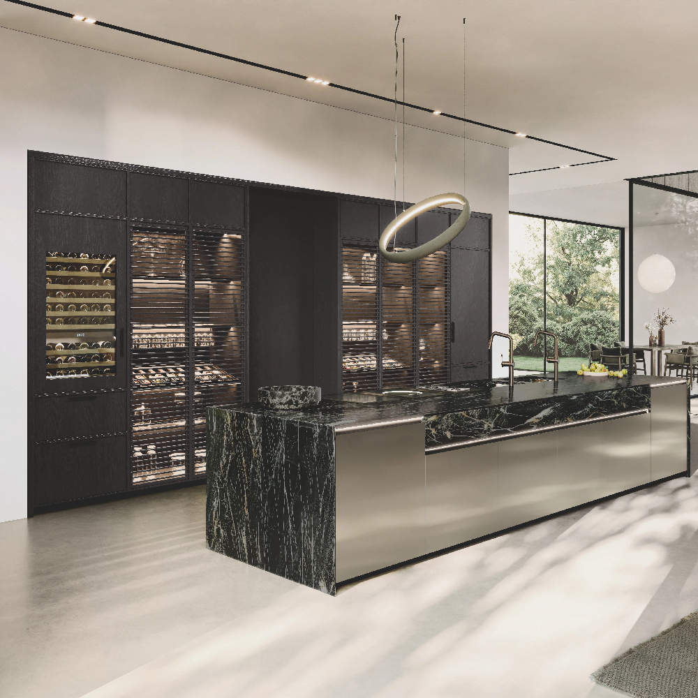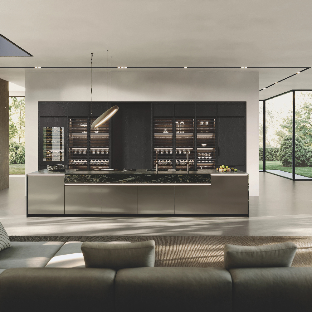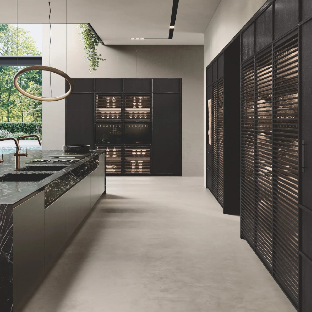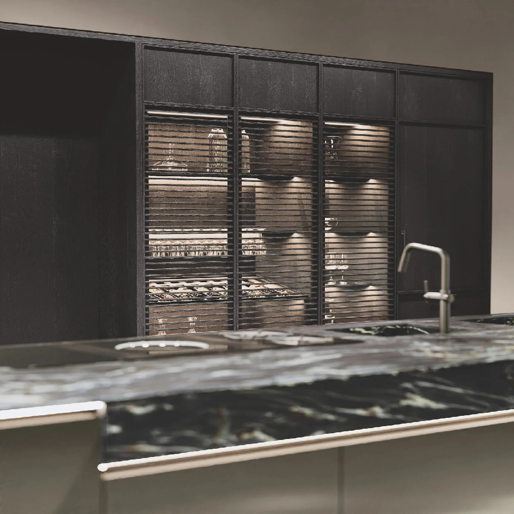 In a symphony of materials and finishes, the kitchen becomes an authentic sensory experience, where every detail is a note of harmony. The Bluna island, theatre of taste and functional soul of the kitchen area, is characterised by the refined encounter between the black backdrop of the top and the monobloc cover in natural stone together with the metallic elegance of the doors in Dakhìa Beige. To enhance the visual experience and create a unique and enveloping atmosphere, the innovative emme groove integrates LED profile to illuminate the location where food preparation becomes an art. The Hily colonnade, with its distinctive wood frame, serves as the background of the island while the Zen windows, which feature alternating wooden slats concealing smoked glass, lead to the exploration of spaces and functions related to the diverse needs of modern living.