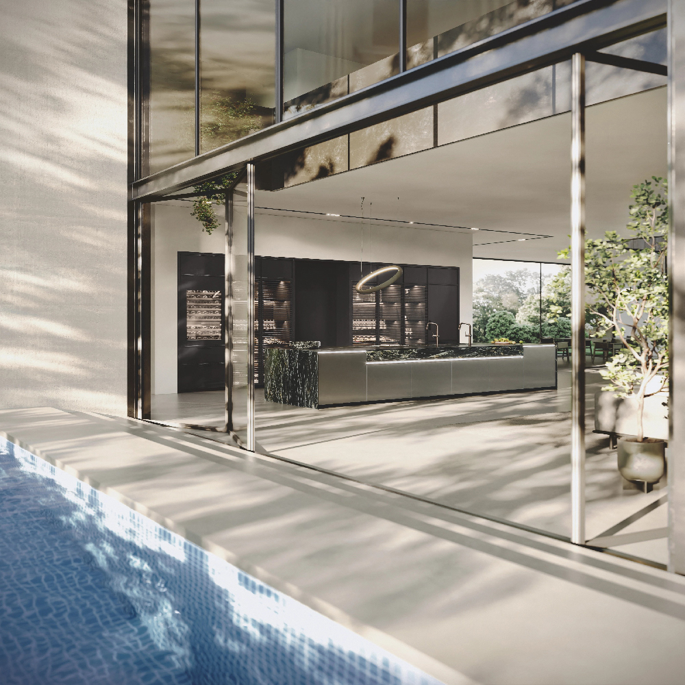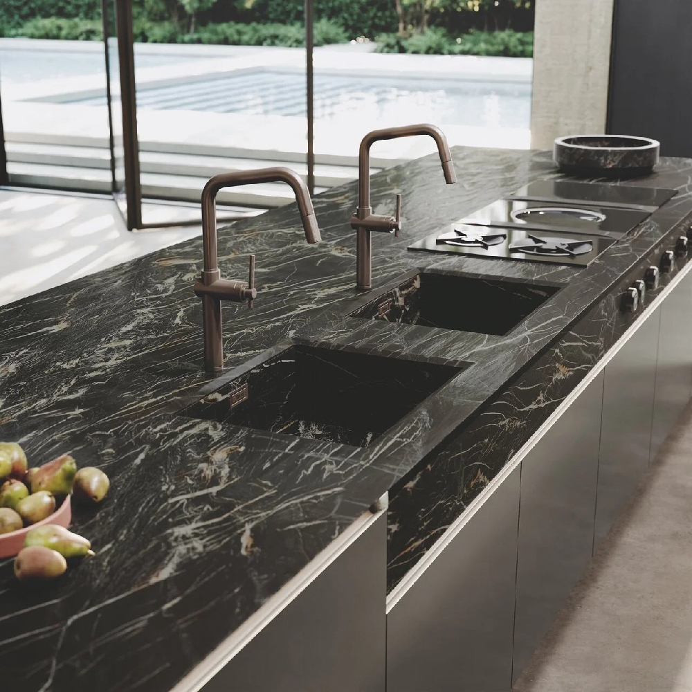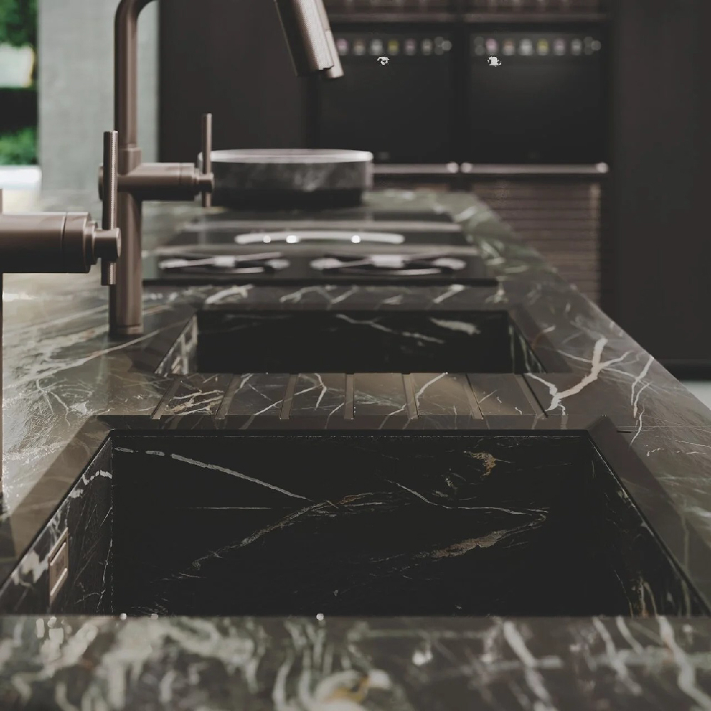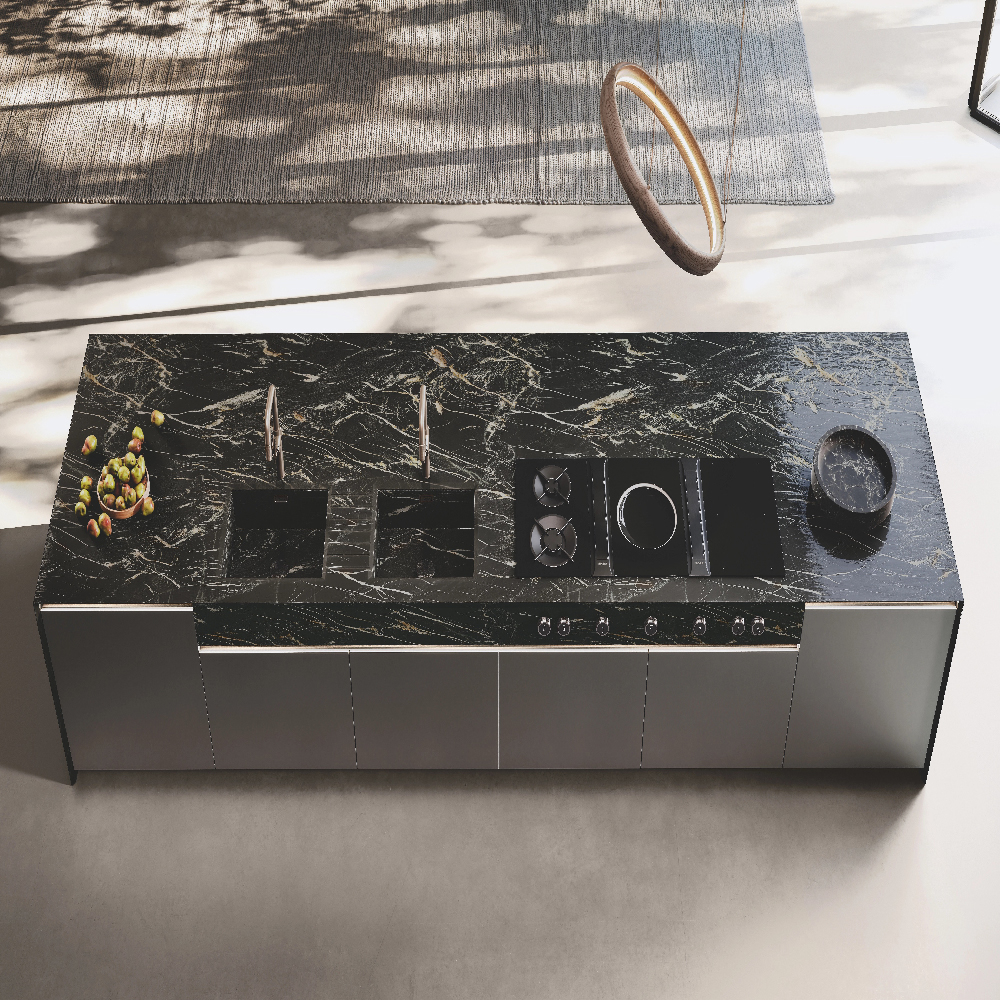 In a symphony of materials and finishes, the kitchen becomes an authentic sensory experience, where every detail is a note of harmony. The Bluna island, theatre of taste and functional soul of the kitchen area, is characterised by the refined encounter between the black backdrop of the top and the monobloc cover in natural stone together with the metallic elegance of the doors in Dakhìa Beige. To enhance the visual experience and create a unique and enveloping atmosphere, the innovative emme groove integrates LED profile to illuminate the location where food preparation becomes an art. The Hily colonnade, with its distinctive wood frame, serves as the background of the island while the Zen windows, which feature alternating wooden slats concealing smoked glass, lead to the exploration of spaces and functions related to the diverse needs of modern living.