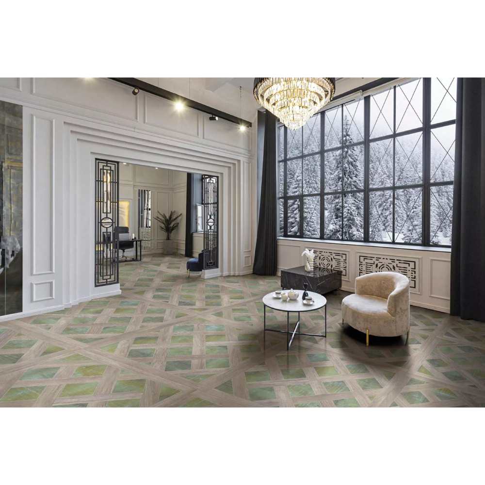 The Intarsio porcelain tile collection by Apavisa combines the warmth of wood with the refined textures of terrazzo and metals, creating a versatile and sophisticated design for contemporary and classic interiors. Available in 24”x24” and 40”x40” formats, Intarsio offers a rich color palette including Beige, Navona, Green, Grey, and Maple, enabling designers to adapt it seamlessly to any space.