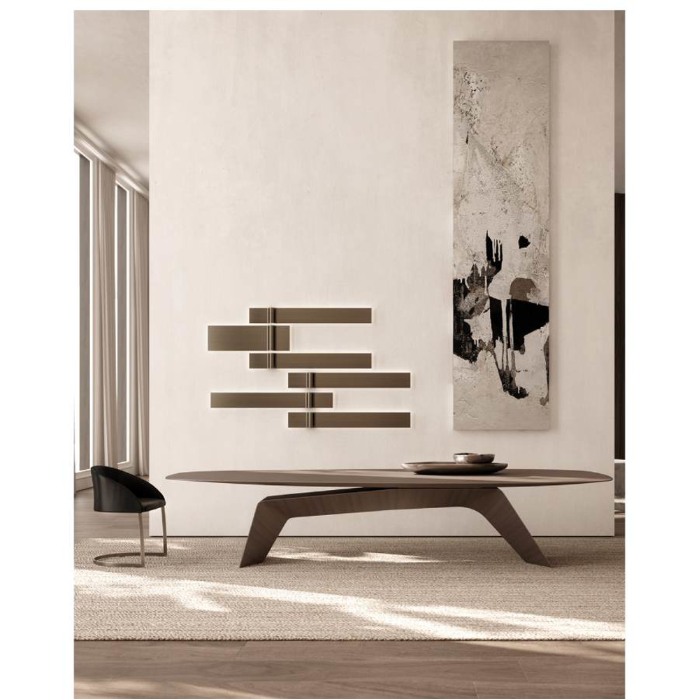 Kintai is a sculptural table with a strong visual impact, characterized by a game of balance between the elements that make it up. A true domestic architecture that evokes the oriental world and the theme of Zen balance. A balance that is not only static but also formal. The massive, solid, imposing base is contrasted with a thin, elegant, floating top. Still and moving at the same time, Kintai is an expression of Zen balance.