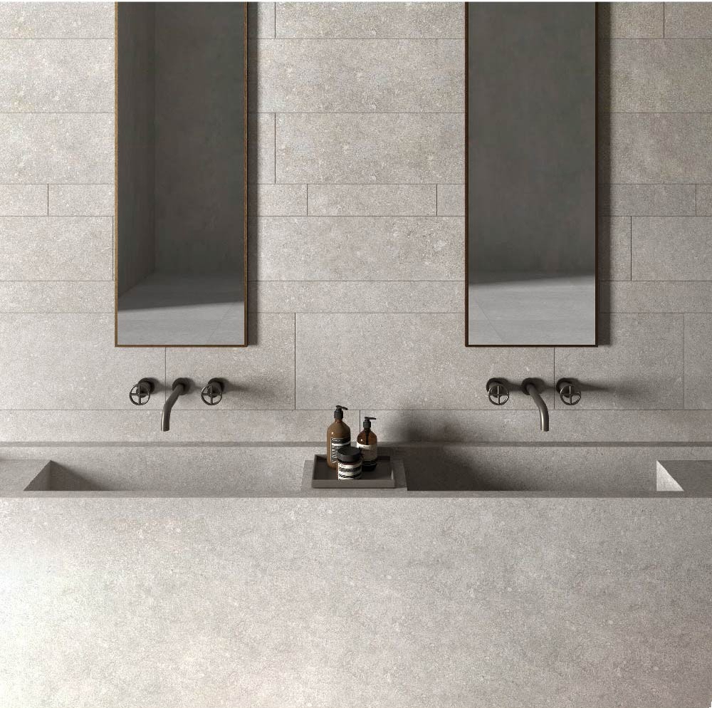 With its blend of natural stone effect, textured surfaces, and high-performance porcelain stoneware, the Reverse series is ideal for creating coordinated design projects with a strong architectural identity.