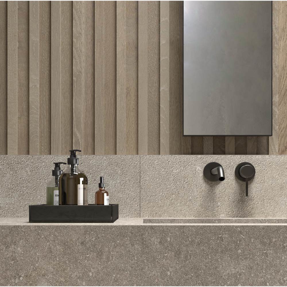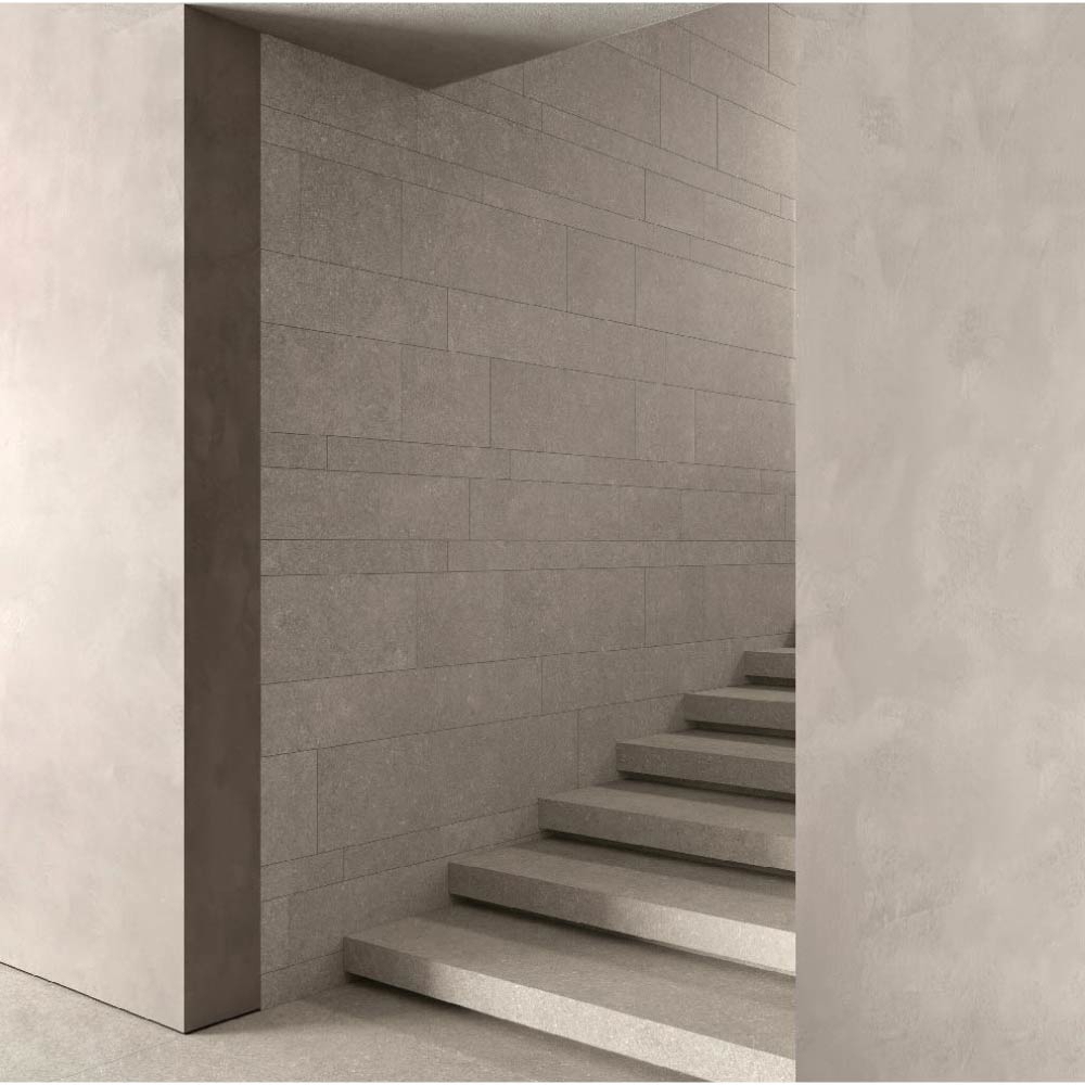 With its blend of natural stone effect, textured surfaces, and high-performance porcelain stoneware, the Reverse series is ideal for creating coordinated design projects with a strong architectural identity.
