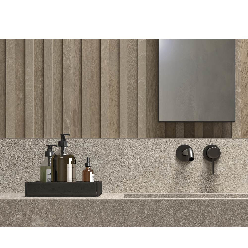 With its blend of natural stone effect, textured surfaces, and high-performance porcelain stoneware, the Reverse series is ideal for creating coordinated design projects with a strong architectural identity.