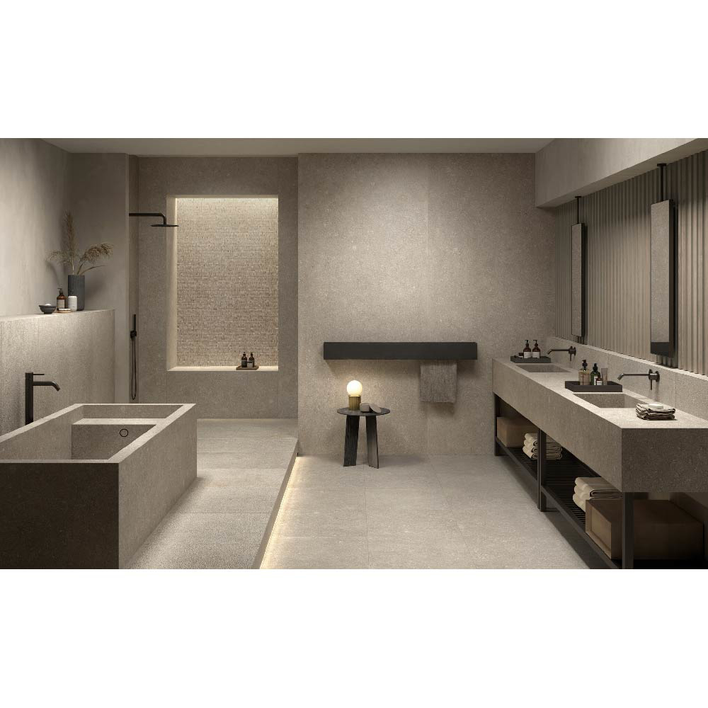 With its blend of natural stone effect, textured surfaces, and high-performance porcelain stoneware, the Reverse series is ideal for creating coordinated design projects with a strong architectural identity.