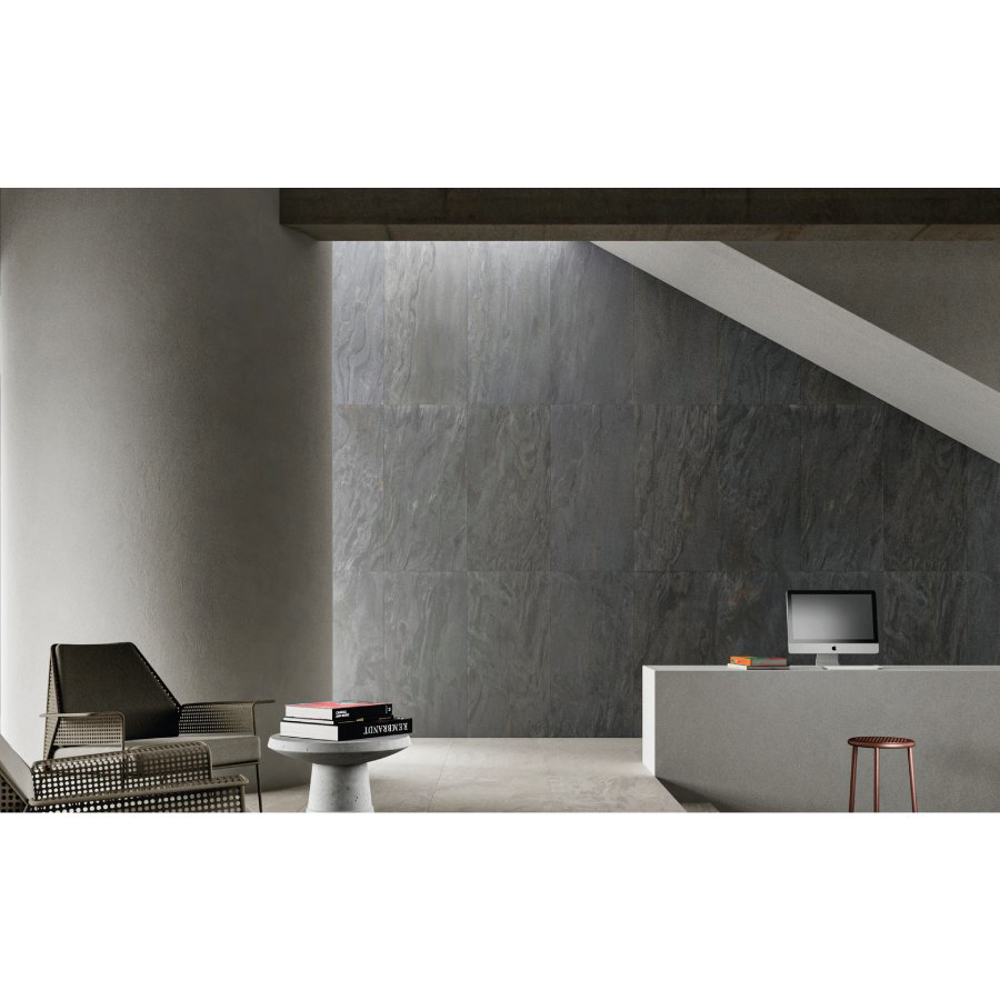 The graphic design is rich in movement and depth, revealing iridescent, ever-changing surfaces with exceptional detail. Inspired by the natural evolution of magmatic stone, Liquid Stone porcelain tiles combine elegant lines with a raw, dynamic aesthetic. Color palettes range from refined neutral tones such as Inox, Sand, and Moss to deeper, more intense shades including Mud, Bronze, and Black, creating a continuous fusion of reflections and tonal variations.