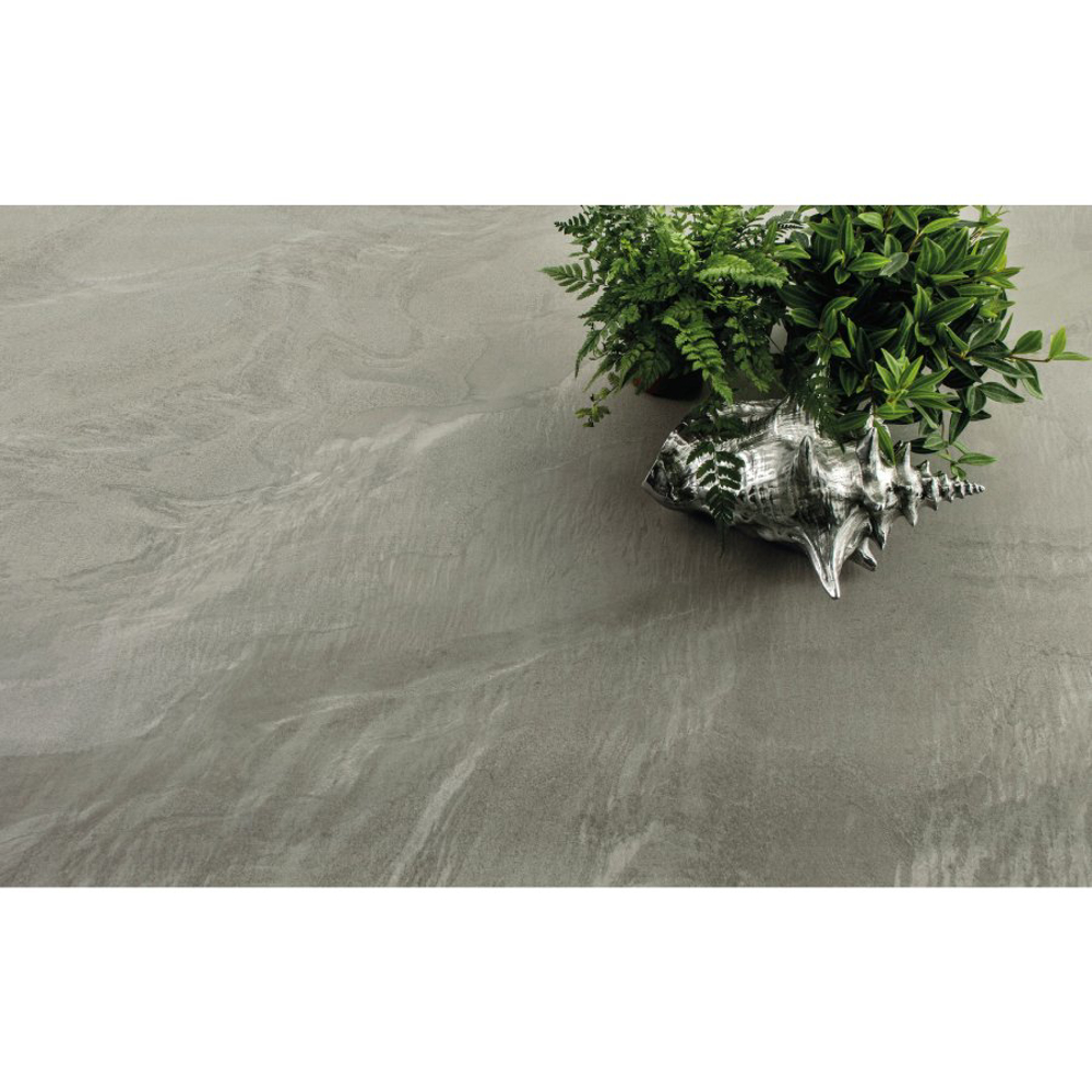 The graphic design is rich in movement and depth, revealing iridescent, ever-changing surfaces with exceptional detail. Inspired by the natural evolution of magmatic stone, Liquid Stone porcelain tiles combine elegant lines with a raw, dynamic aesthetic. Color palettes range from refined neutral tones such as Inox, Sand, and Moss to deeper, more intense shades including Mud, Bronze, and Black, creating a continuous fusion of reflections and tonal variations.