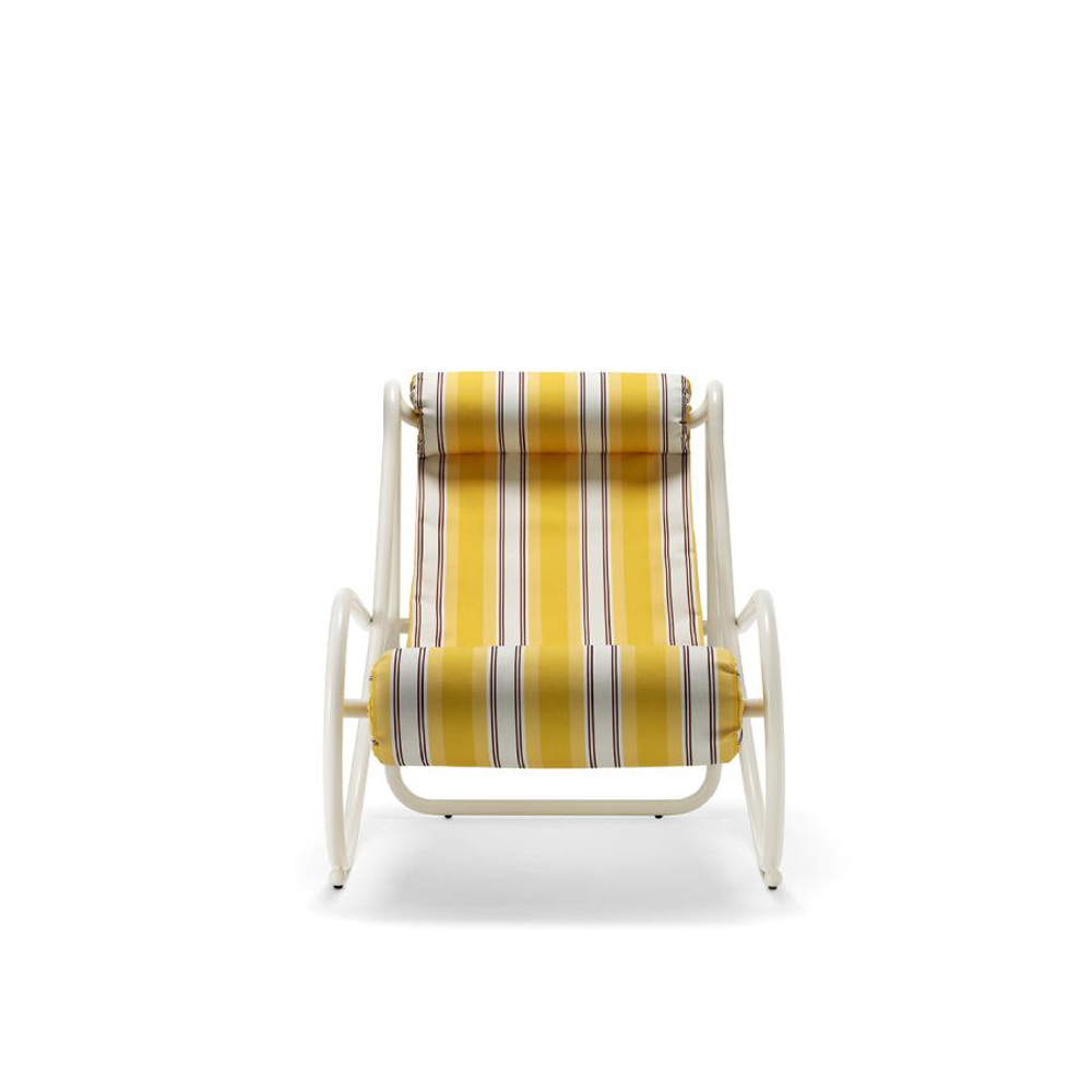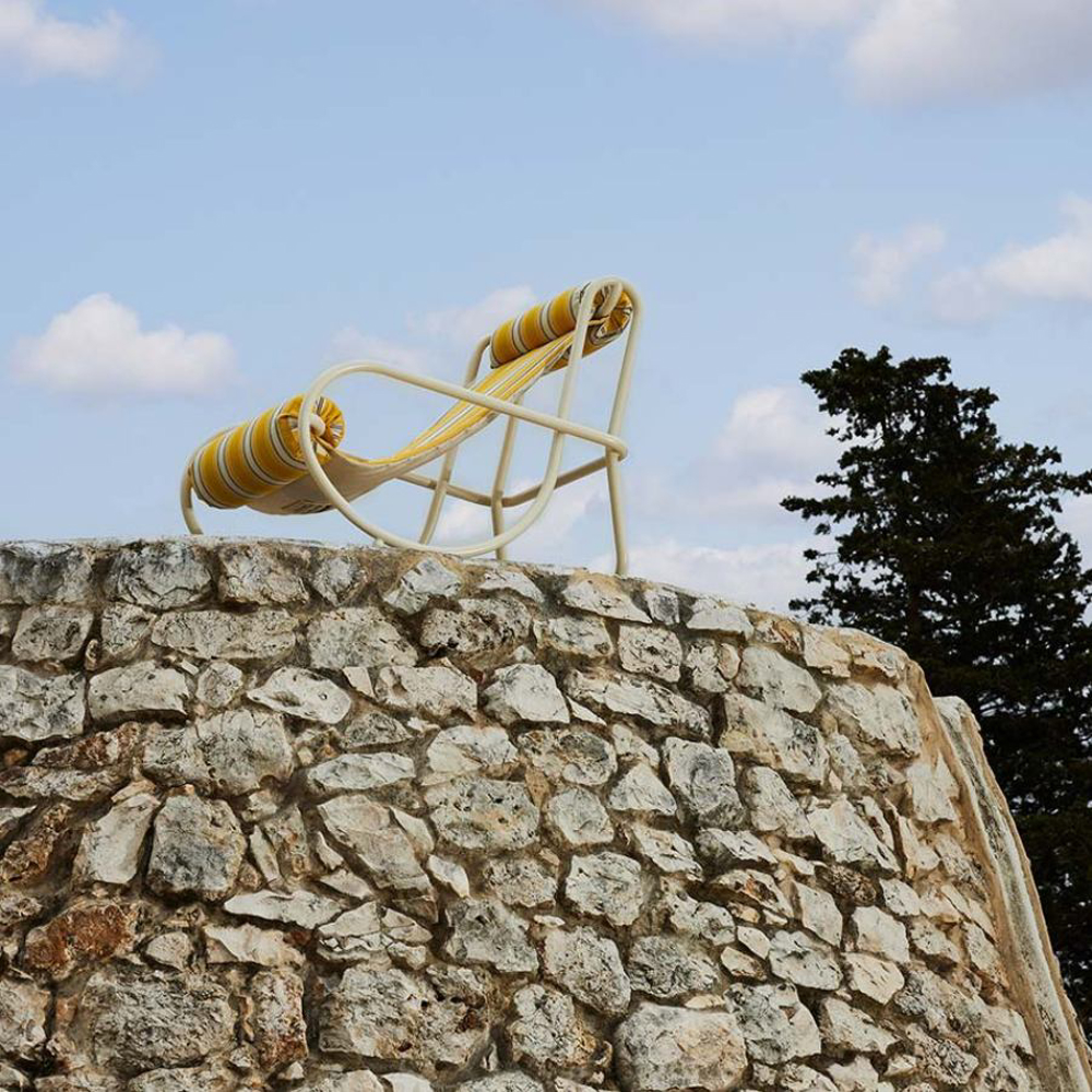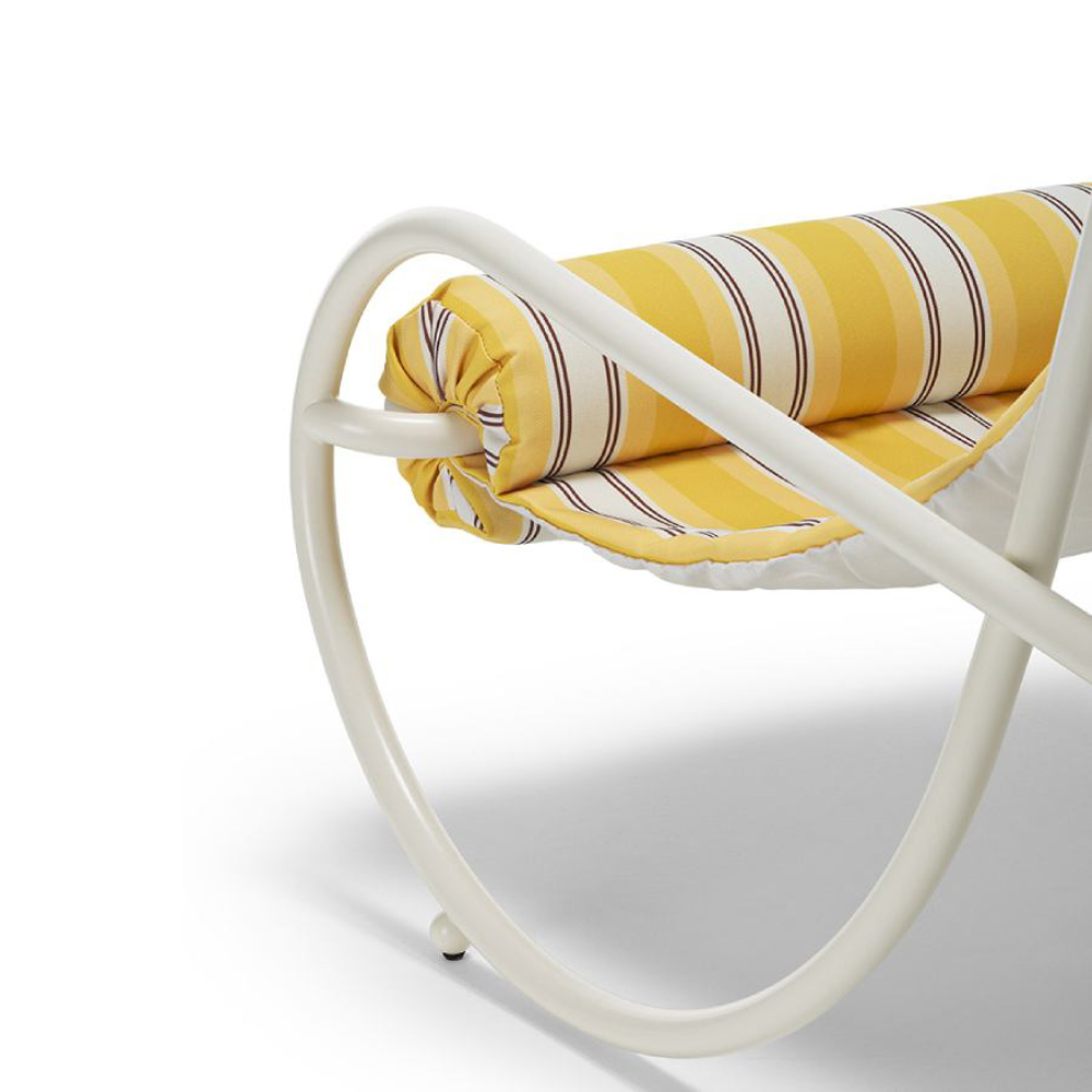 The frame of the Locus Solus Armchair is made of painted stainless steel tubulars. This capsule collection offers an Off-White metal structure with seats available in two versions: yellow-striped or beige fabric with contrasting hand-embroidered details.