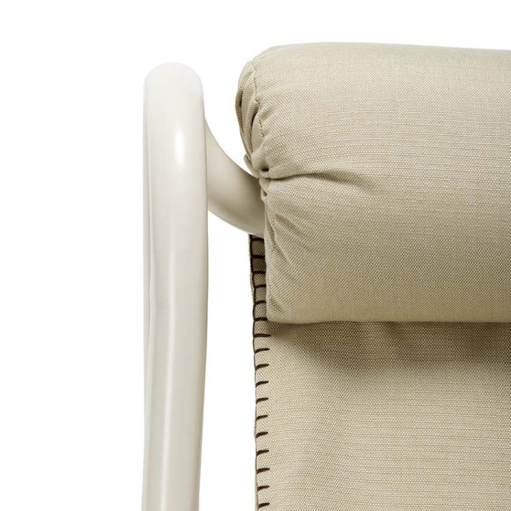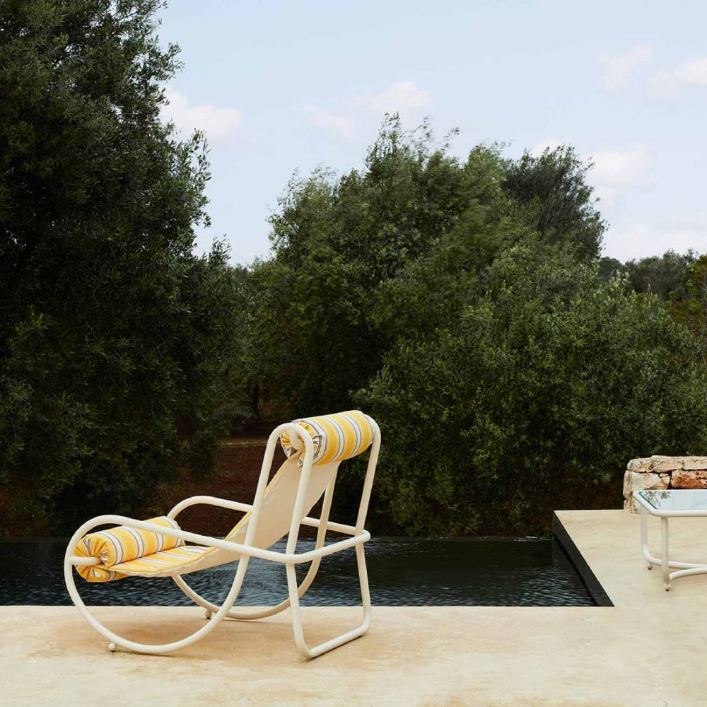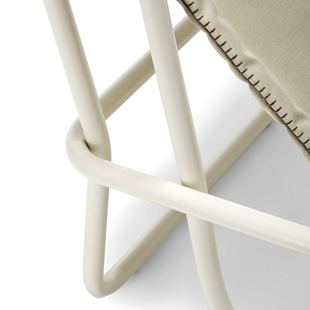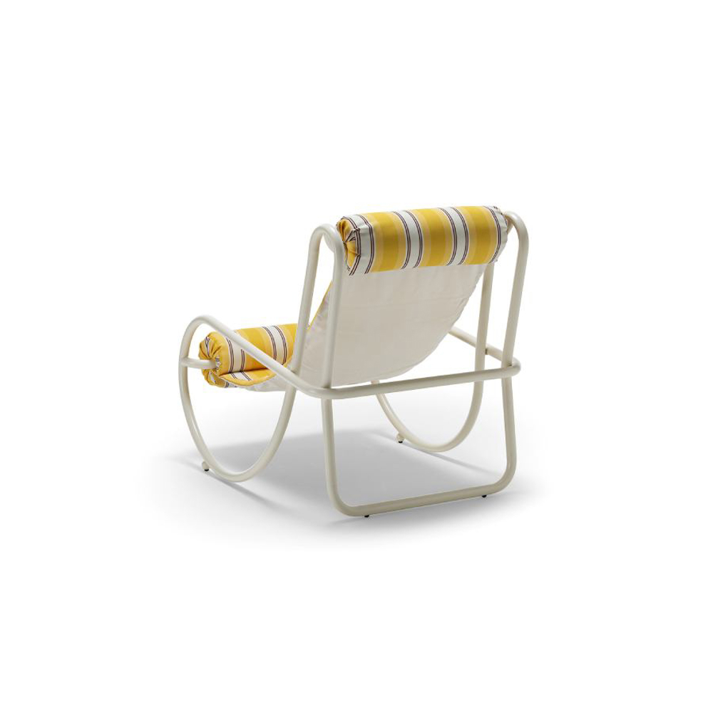 The frame of the Locus Solus Armchair is made of painted stainless steel tubulars. This capsule collection offers an Off-White metal structure with seats available in two versions: yellow-striped or beige fabric with contrasting hand-embroidered details.