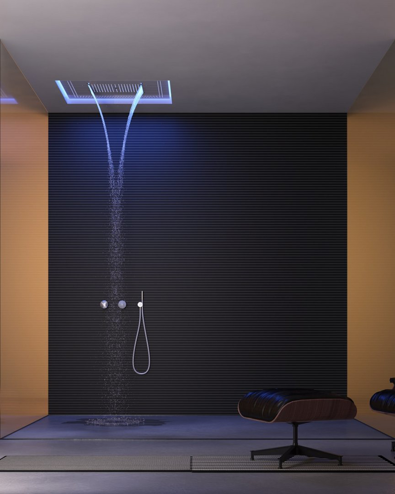 The considerate dimensions allow Meteo XXL to accommodate over conventional modules: two waterfalls, 4 nebulizers and a perimeter barrier made of a double row of staggered nozzles. A configuration that increases the functionality of the system and facilitates installation in locations without traditional showers thanks to a delimitation barrier. The two waterfalls have an oblique jet that meets in the center and also in the center is a particular nozzle that generates a very hard jet. The built in shower head is available in stainless steel with a mirror or white finish, rgb led integrated lighting (chromo-therapy function) including remote. The light adds volume to the space and conveys sensuality. Meteo is an empty space from which water and light come from that allow an extreme personalization of relax.