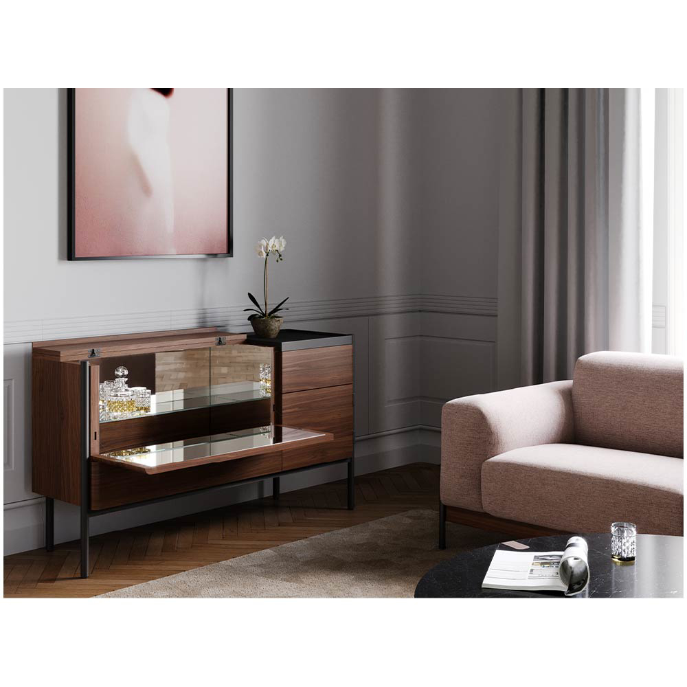 Its clean, minimalistic form belies the treasures it conceals within, offering a hidden reflective surface that provides the perfect backdrop to store your finest bottles.