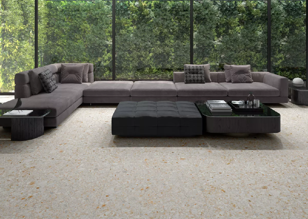 This terrazzo-effect porcelain tile collection can be used on all kinds of surfaces. Thanks to its relaxing modern colour spectrum, it offers a new sophisticated take on vintage terrazzo tiles.