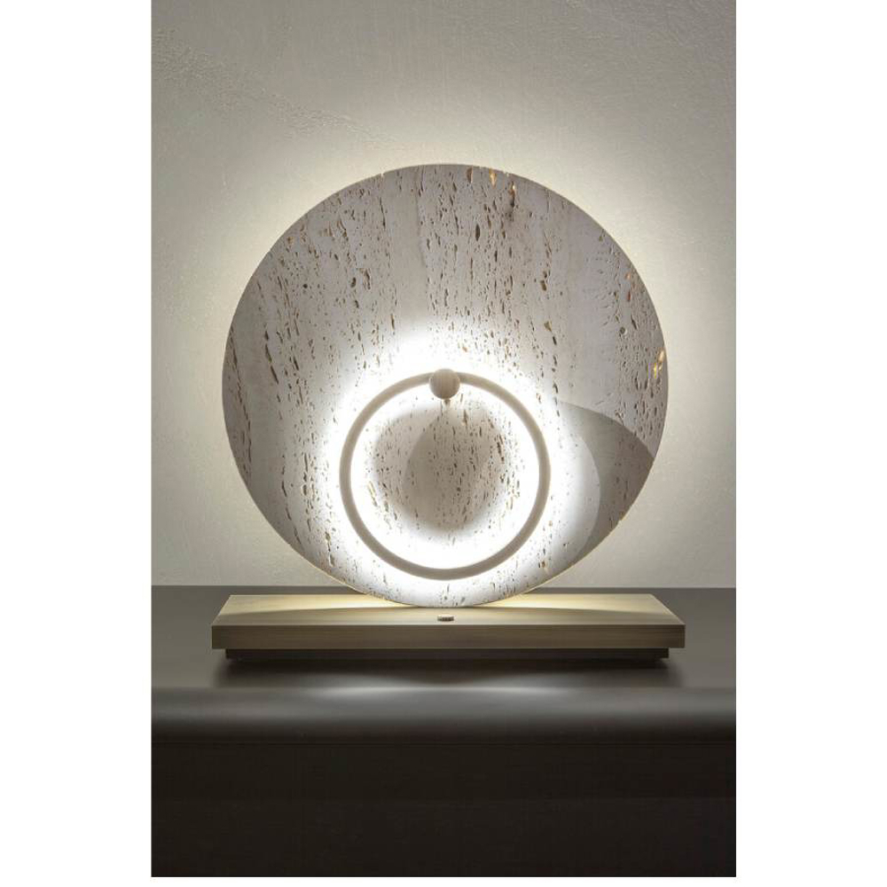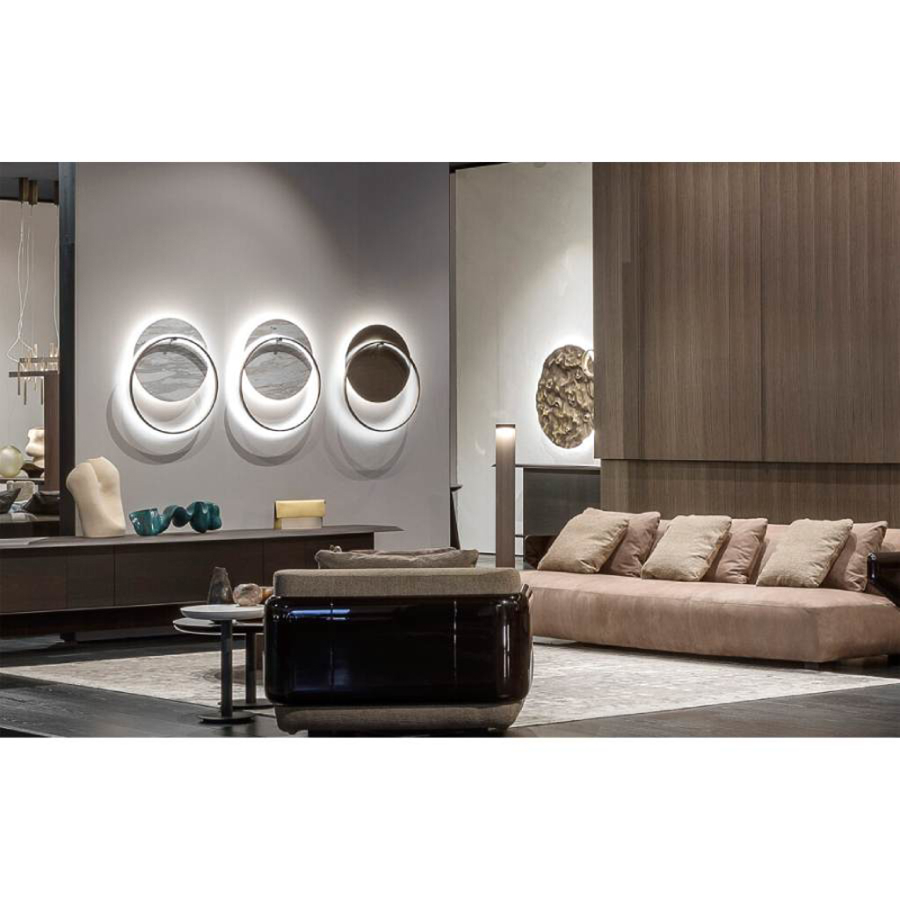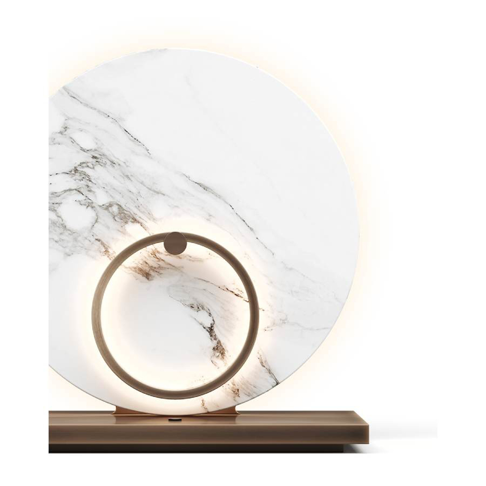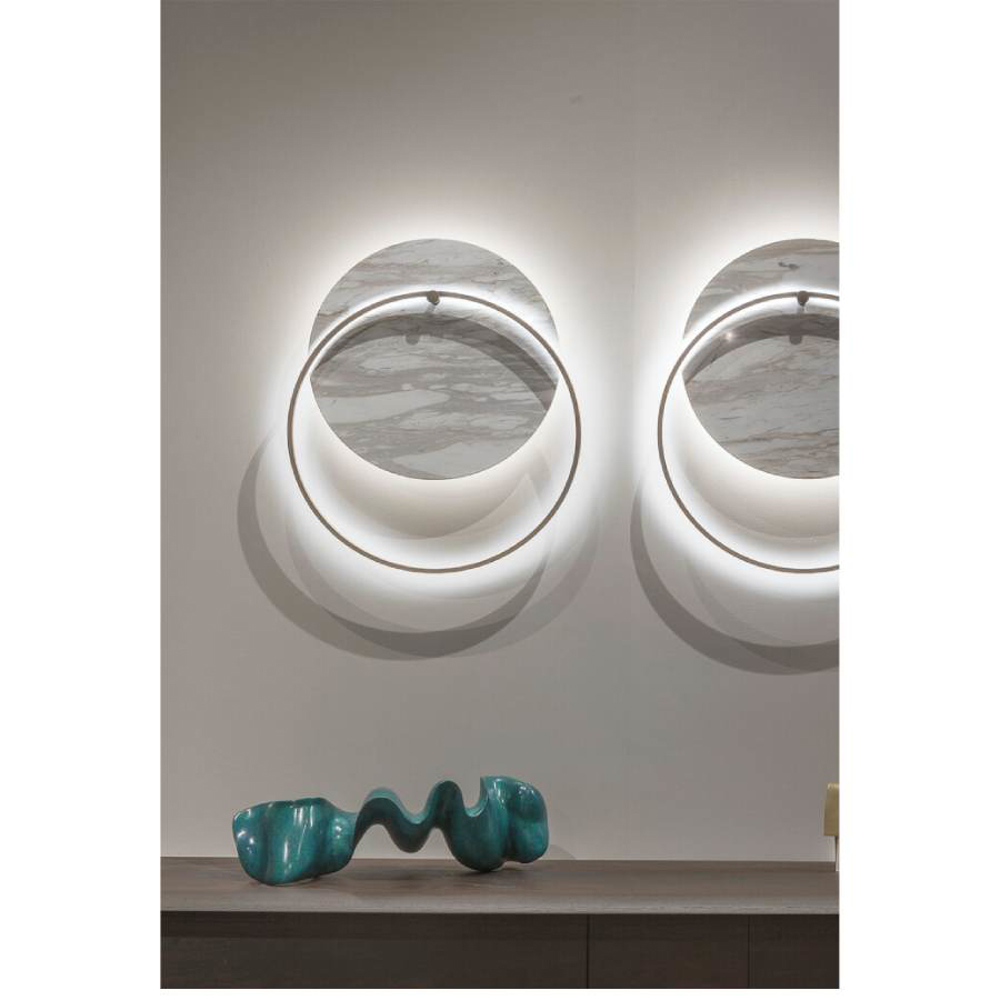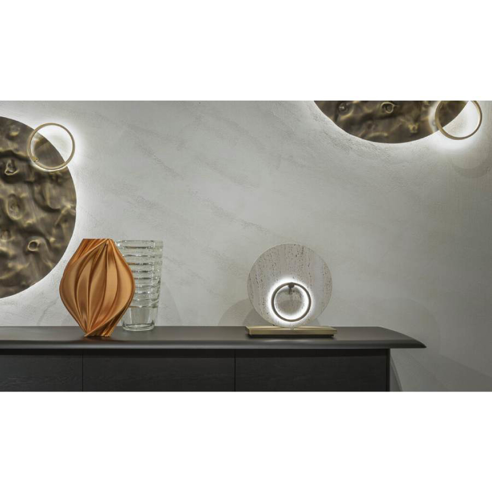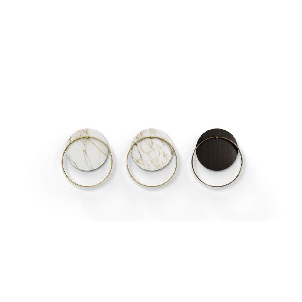 A metal ring. As precious as a jewel can be. A source of light and decoration for the walls of every home, it is positioned on a disc whose finish enhances the union between solids and voids. In fact, they are two circles. Declined in two different ways.