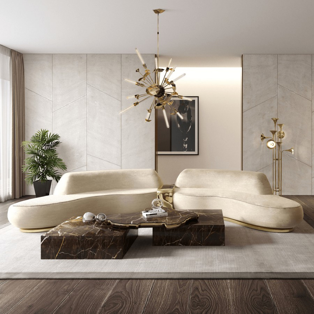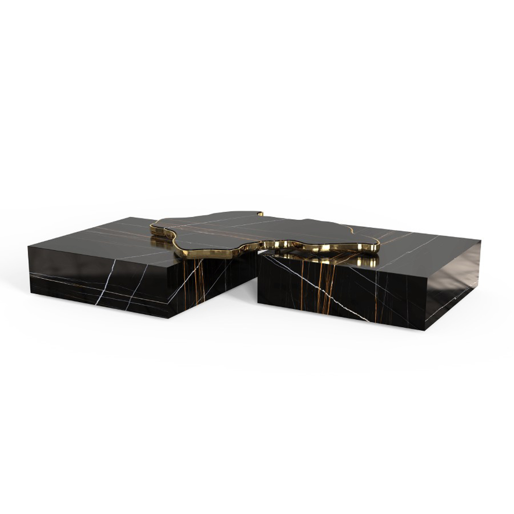 A contemporary center table composed by two square marble modules, linked by an organic marble surface element on top enveloped by casted brass.