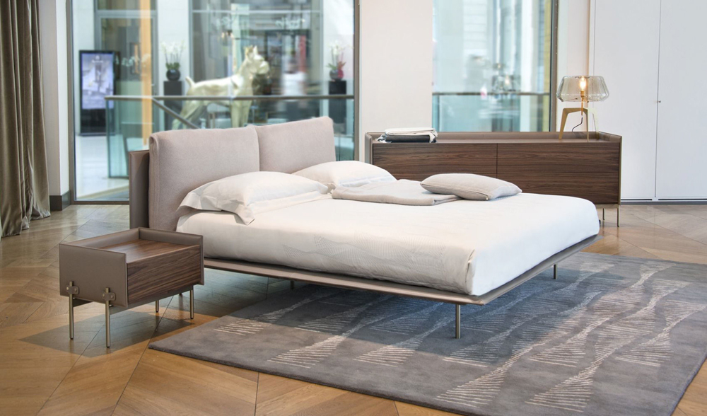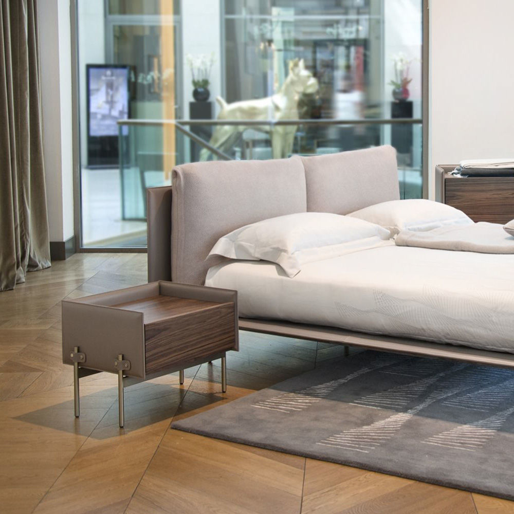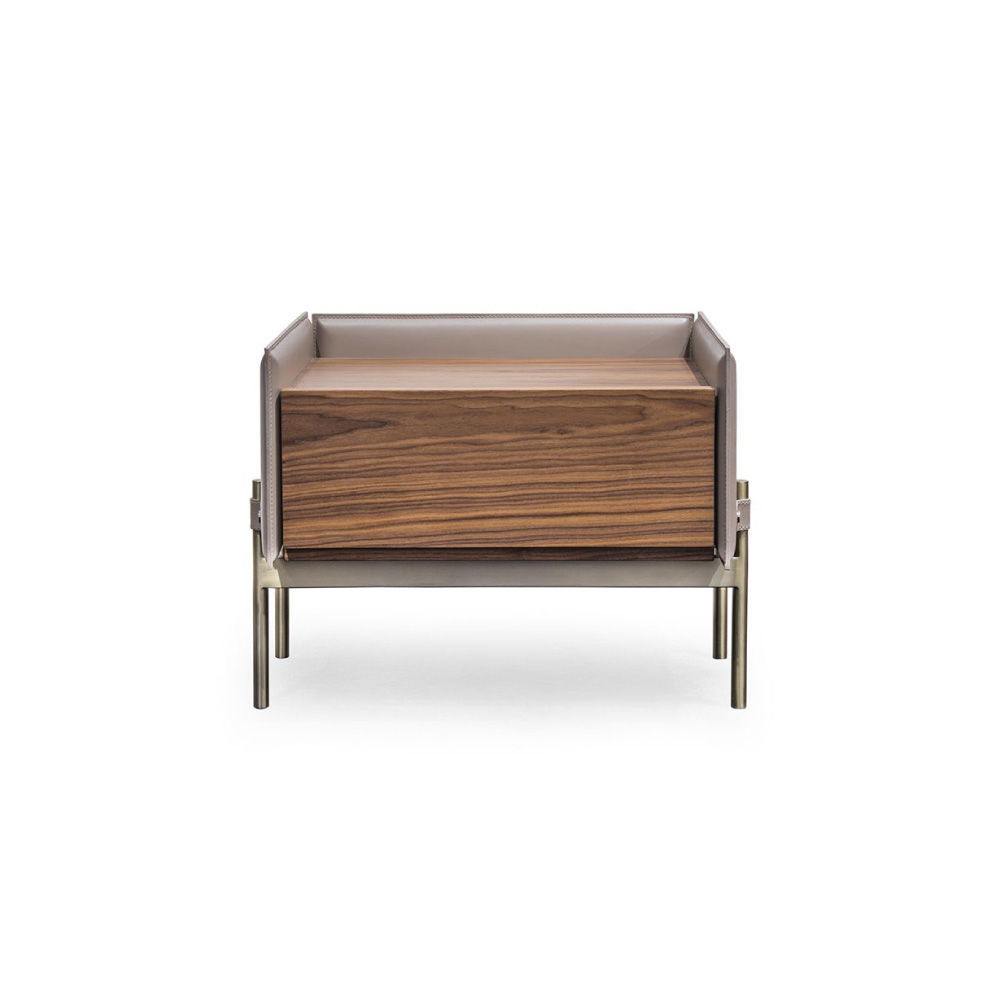 Structure in cuoio leather col Taupe, tone on tone stitching, top and front drawers in Canaletto Walnut veneer open pore finish, metal feet Light Gold satin finish with cuoio leather details.