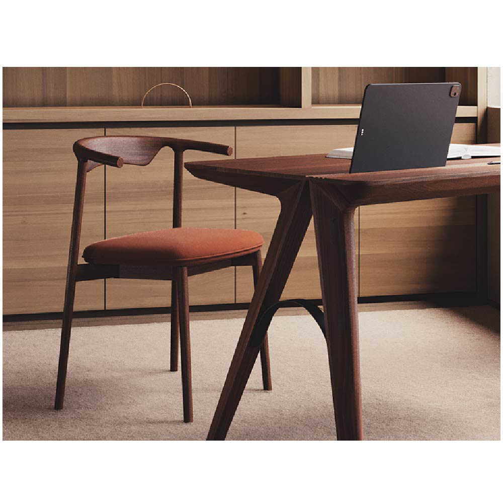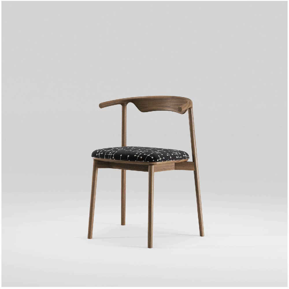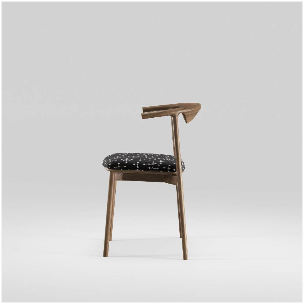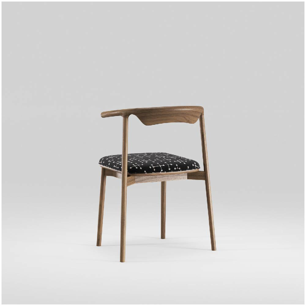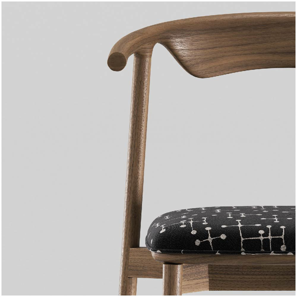 The chair's enveloping elbow rest enhances the dining experience, offering a relaxed and supportive feel that invites long, comfortable meals. The design strikes a balance between sleek, clean lines and the organic beauty of wood, making it an appealing addition to both contemporary and traditional interiors.
