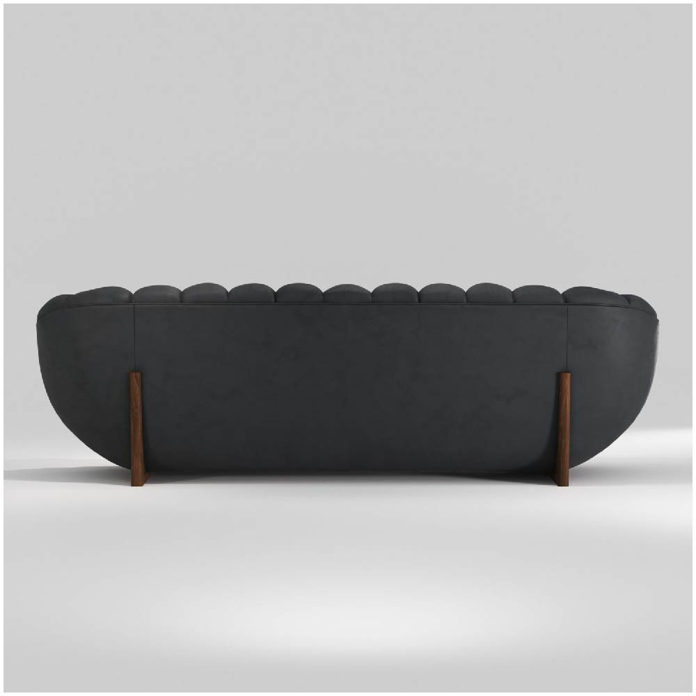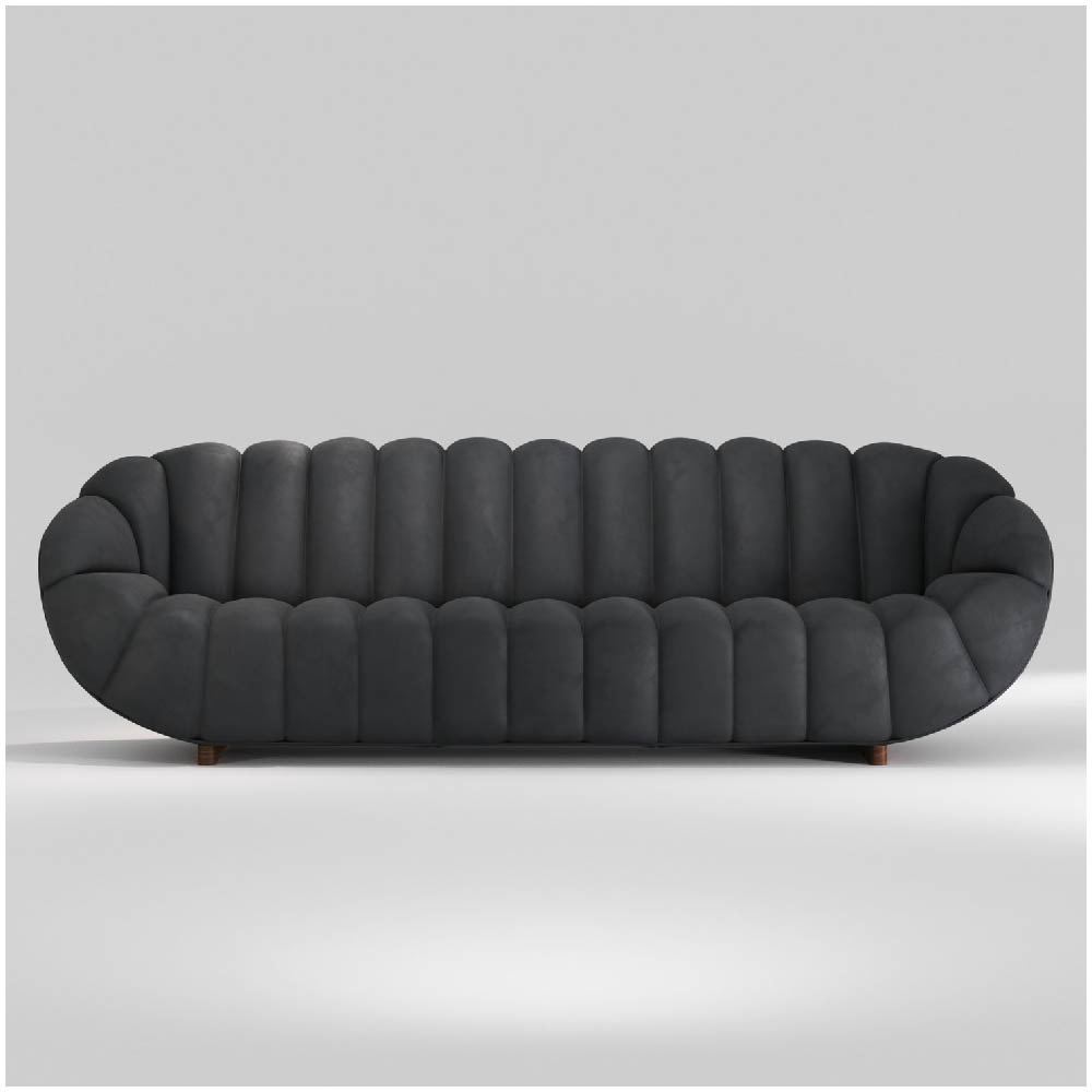The carefully engineered solid wood legs, positioned from back to front, lend the piece a sense of floating suspension, just like the boats it references, adding an airy, architectural quality that enhances its presence in any room. Despite its substantial form, the sofa never feels heavy or imposing.