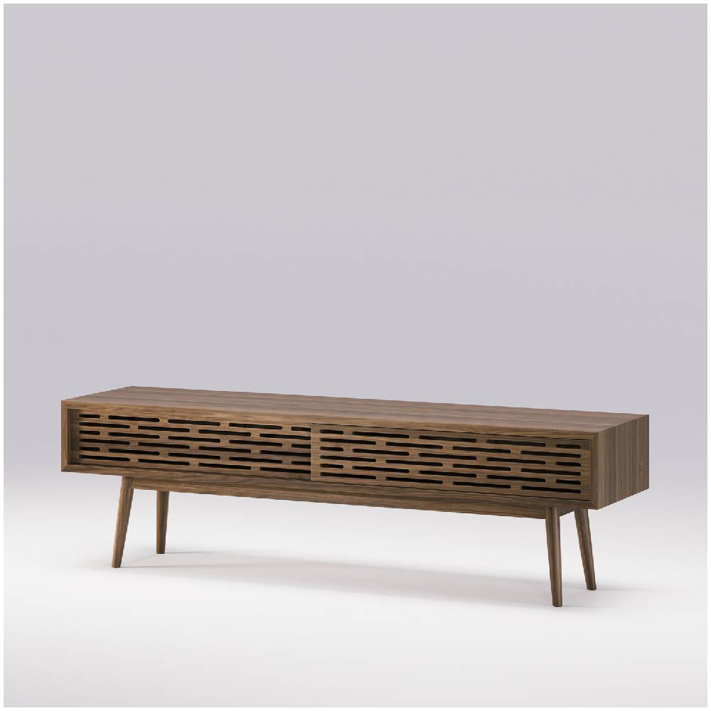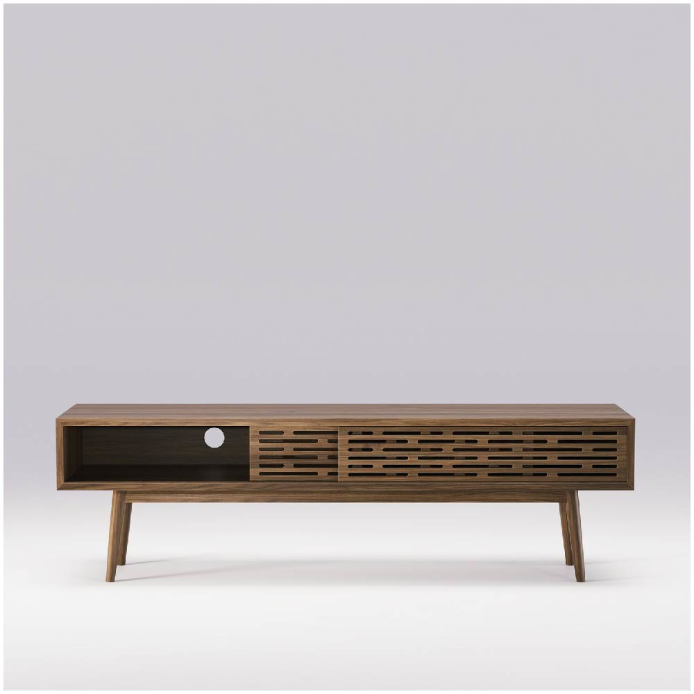 Radio is a 100% solid wood media unit with an exclusive design which emphasizes the woodwork of craftsmen. The perforated sliding doors across the front give the piece a refined visual elegance, adding texture and depth while also serving a practical function.