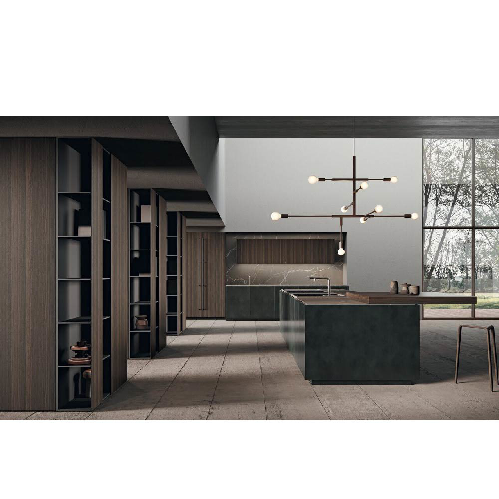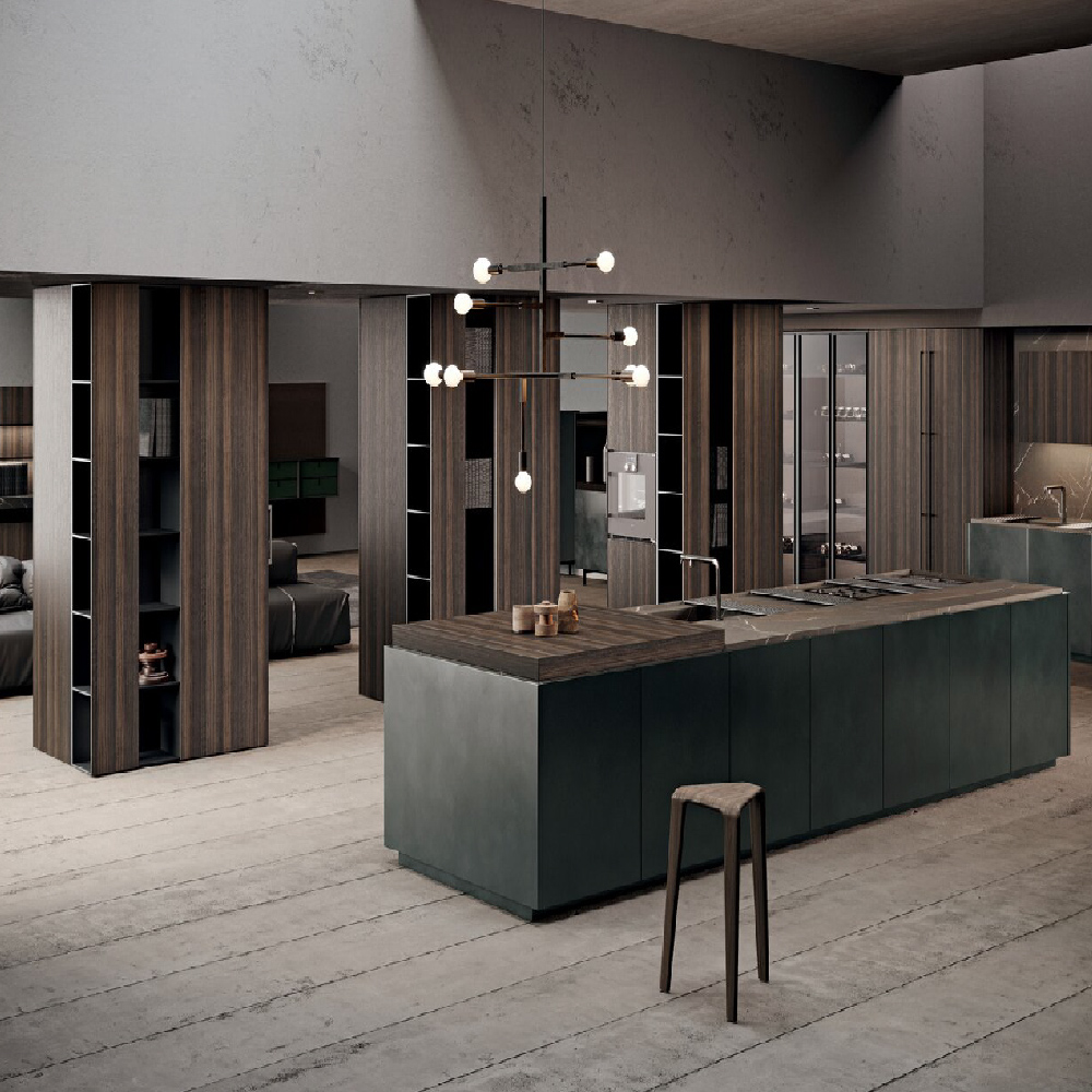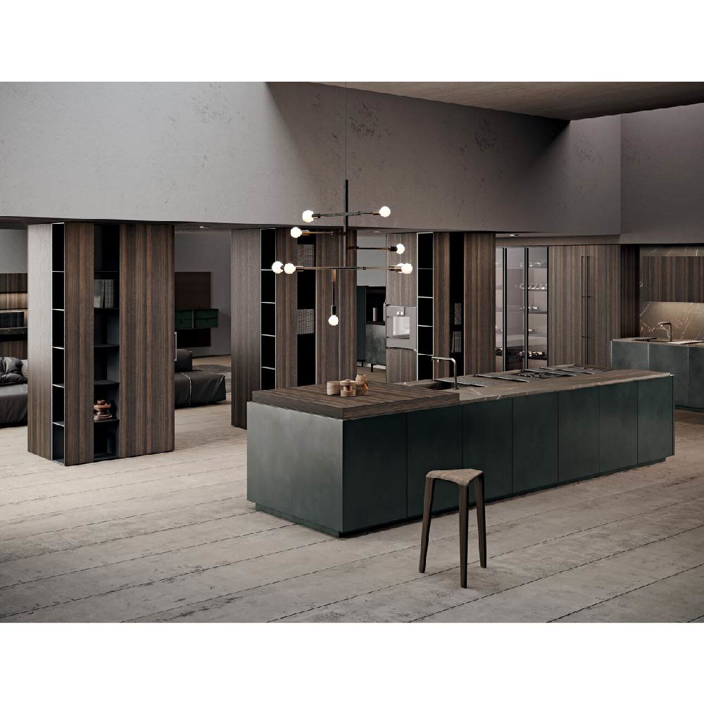 Showing what the others hide means leaving space for imagination. Scava project is characterized by fronts that have a grip on the upper part and which thanks to a worktop built at the same depth of structures allows the opening. A multidirectional research that constantly changes its target, following a smooth top and climbing along three wooden pillars from floor to ceiling. The environment is characterized by two large areas delimited in the center by three wooden pillars with a pantry function and space for built-in appliances. The first area is a kitchen with two work areas, a central island and an equipped wall, while the second offers a large living space with table, sideboards and sofa. An environment to explore without filters, with the feeling of living in a complete interaction between person and space.
