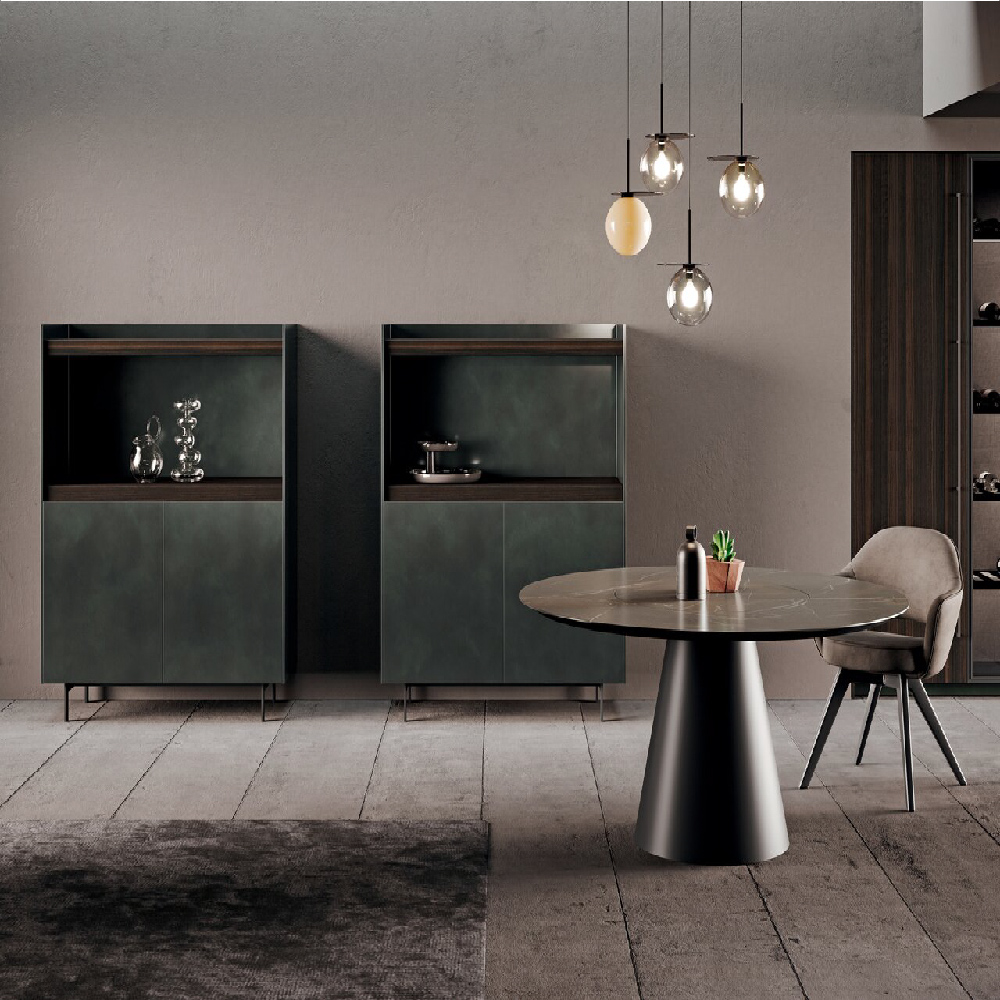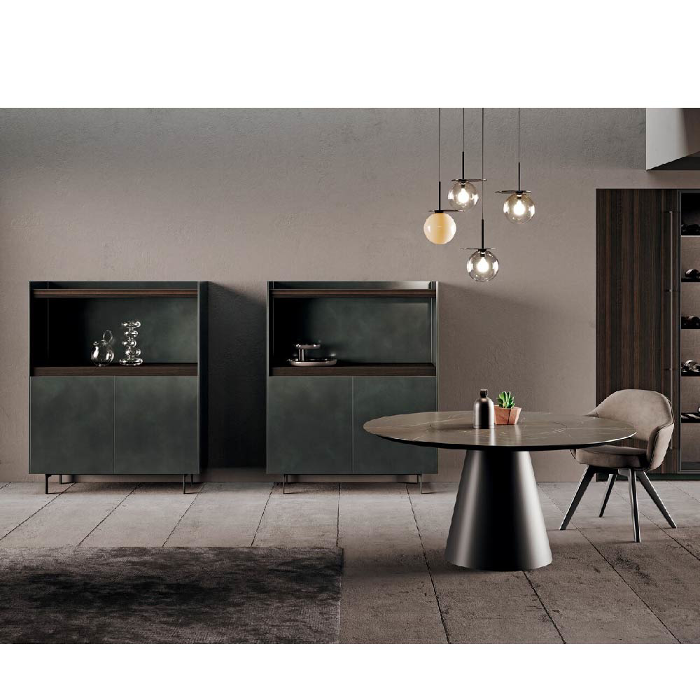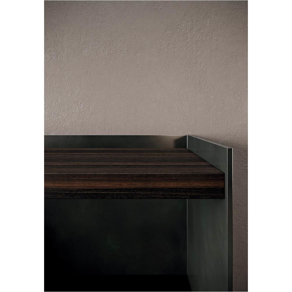Detail of sideboard 4.0 metal lacquered foresta finish and wood eucalipto scuro finish. Lower structure matt black lacquered.