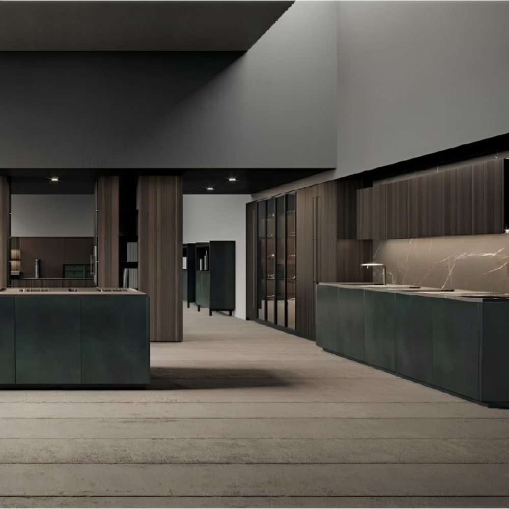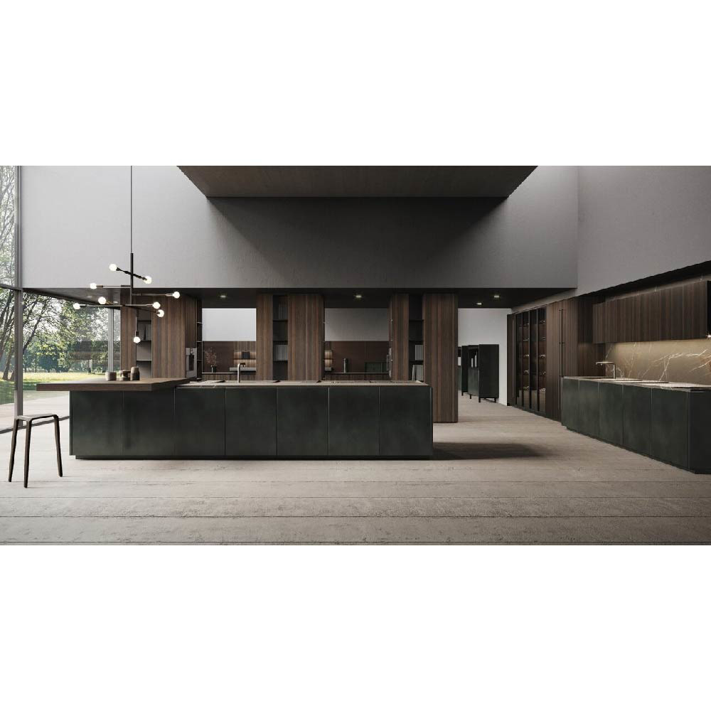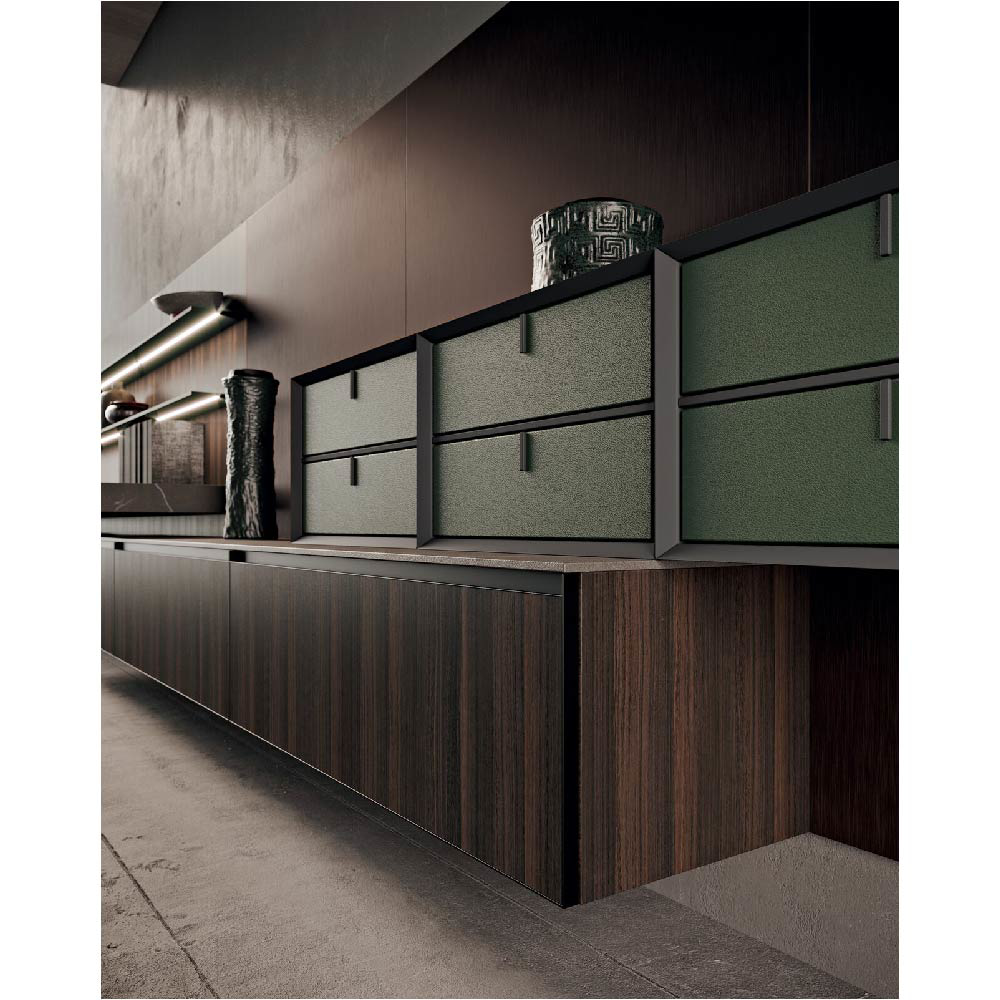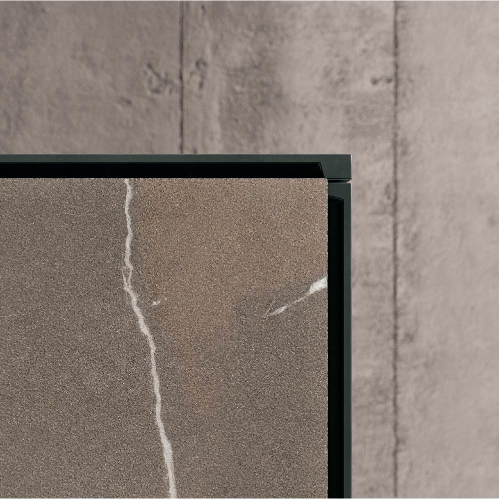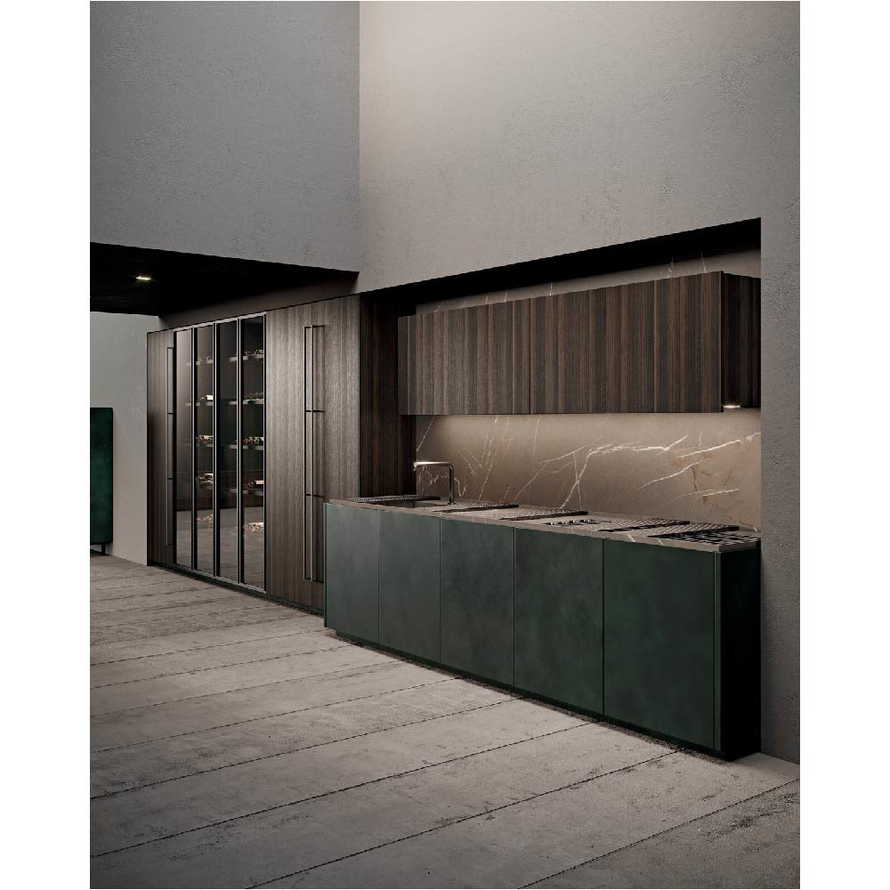 Detail of scava door 4.0 metal lacquered foresta finish and Duna worktop inside gres pietra piasentina taupe fiammata finish.