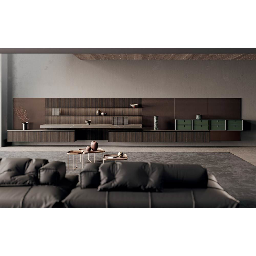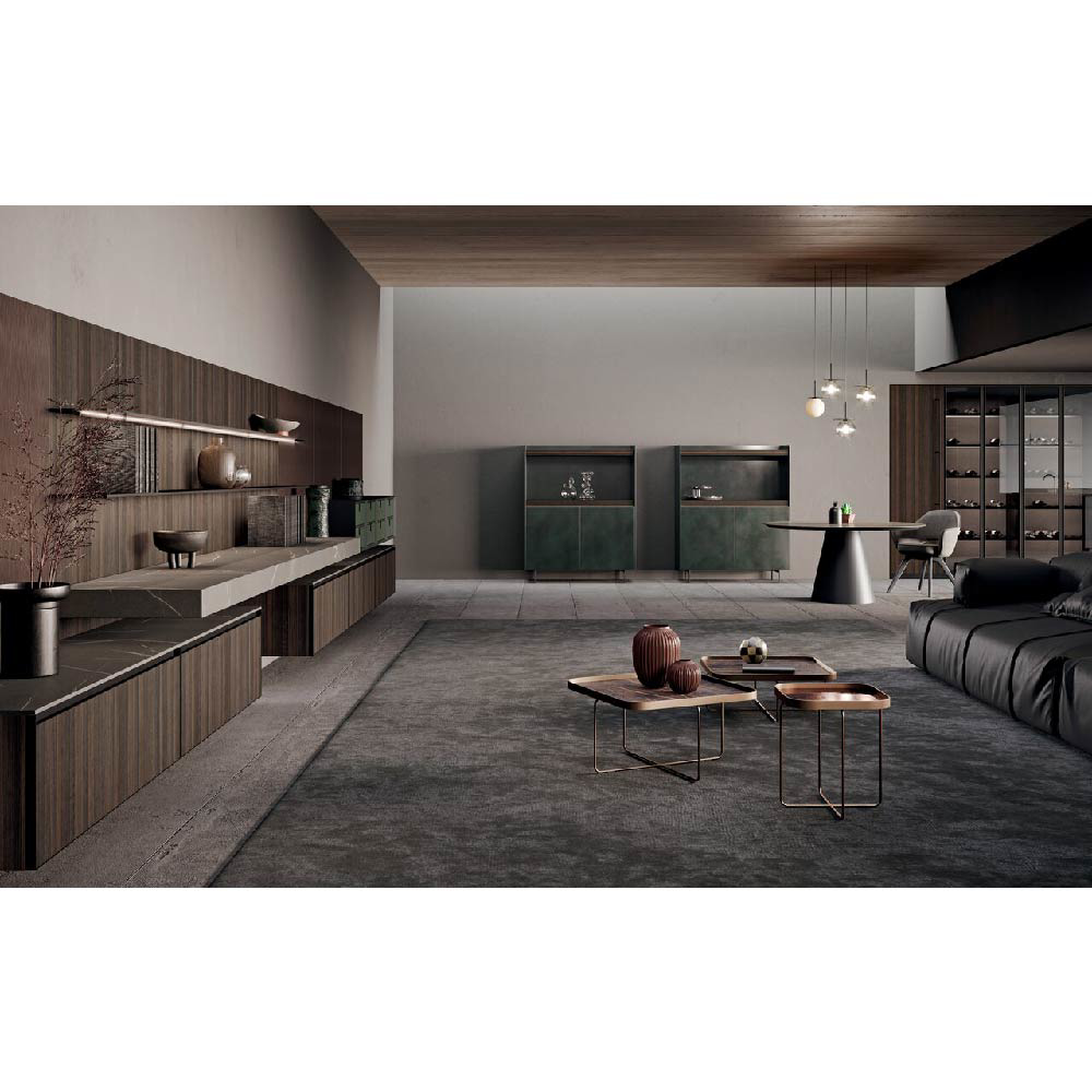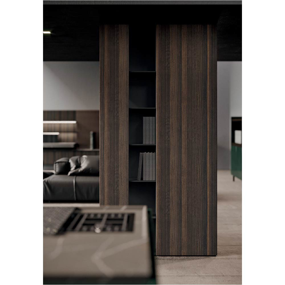 Detail of living wall made in wood bilaminate Noce Monza finish doors and back panels in tech alluminio brunito finish.