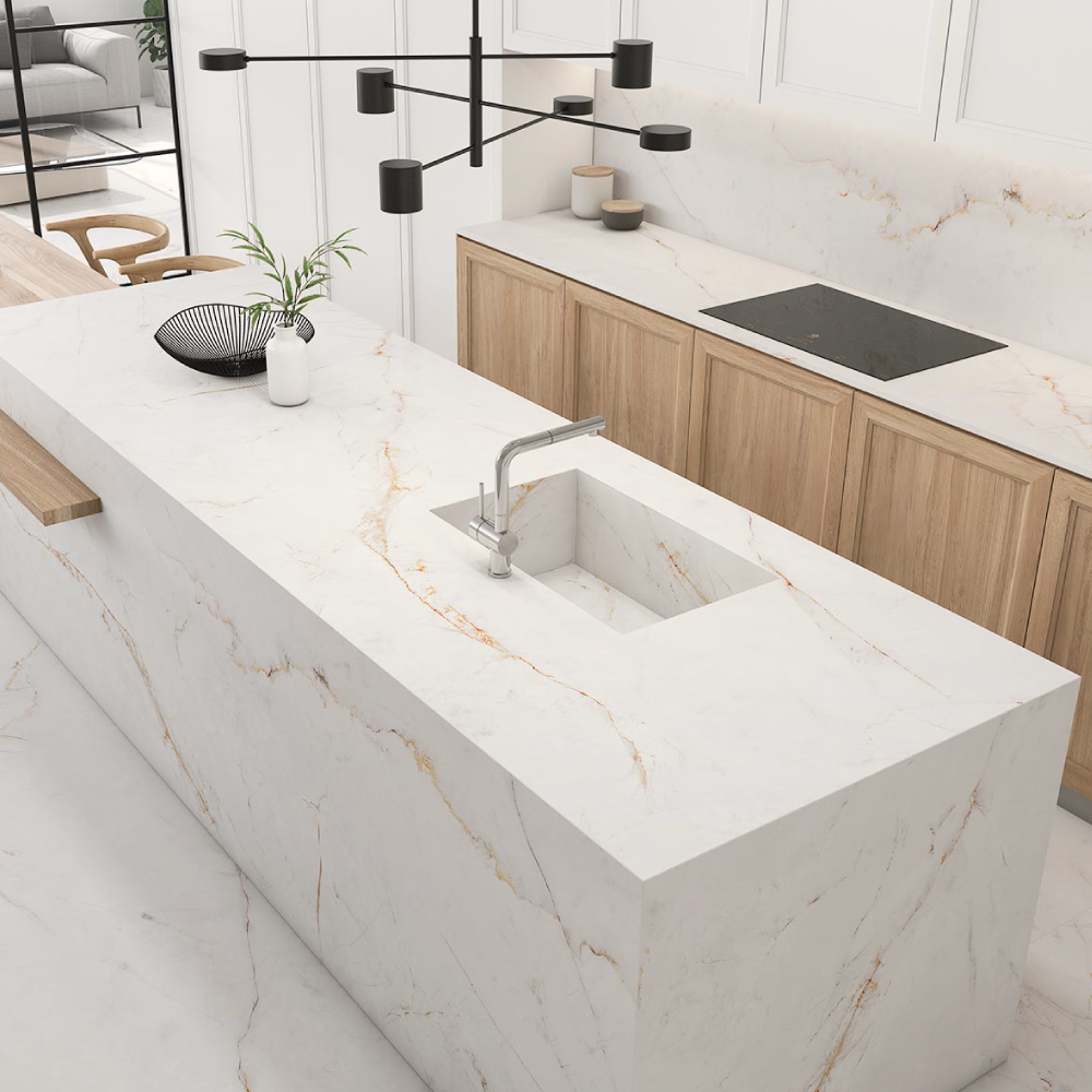 Marblessa Countertops collection is a new sintered mass that provides solutions for kitchen countertop with character and personality. Born as a result of a deep study of decorative trends and the most contemporary demands. Its large dimensions 63"x126", and the extremely high-performance technical features make it an ideal material for the most demanding product applications such as kitchen countertops.