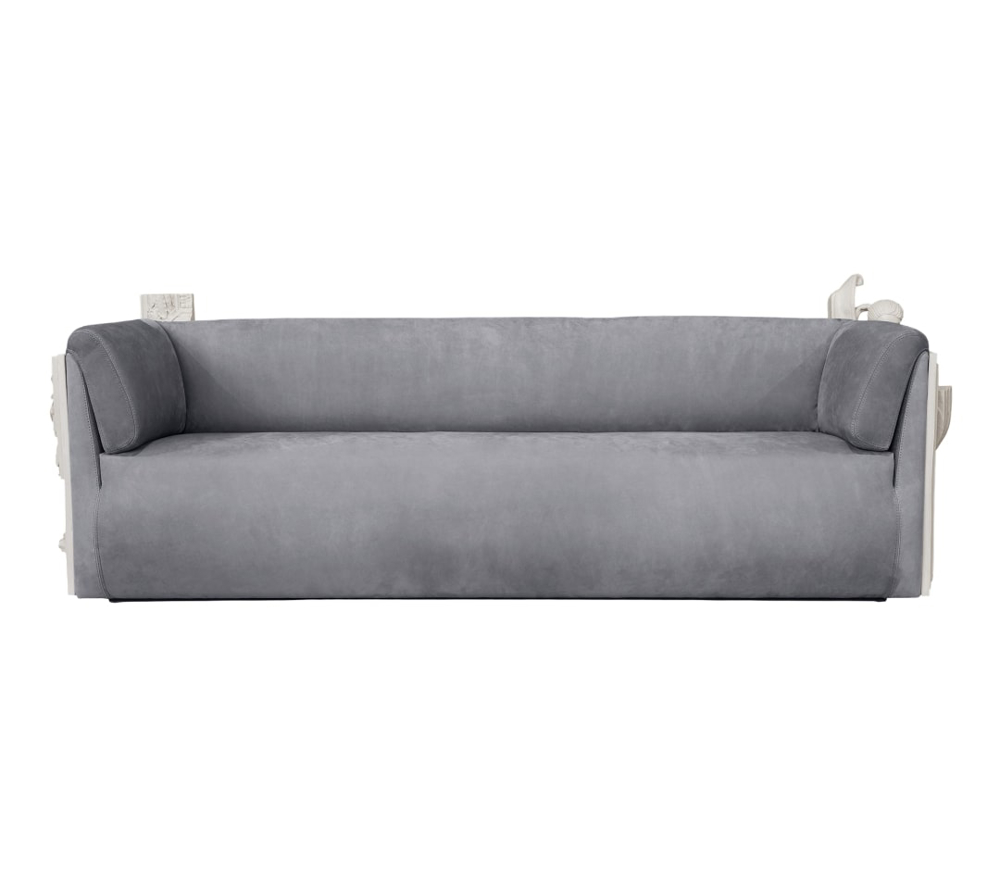 Sofa made in a wood structure and panels in a manual sculpture, produced in resin and finished with restoration techniques similar to stone. The upholstery fabric is made up of six velvety and removable pillows. The legs are produced in acrylic turns.