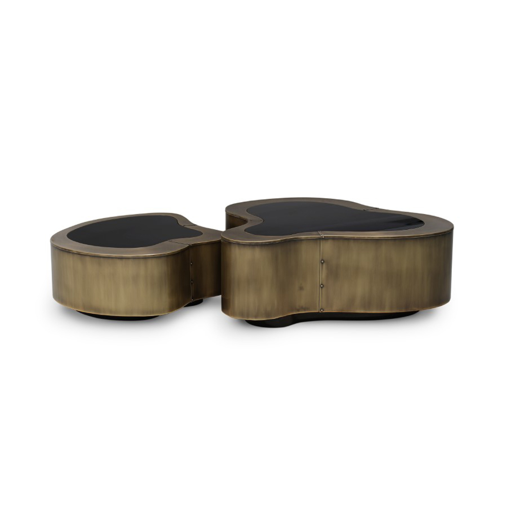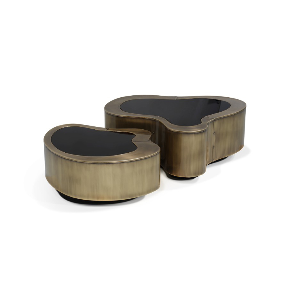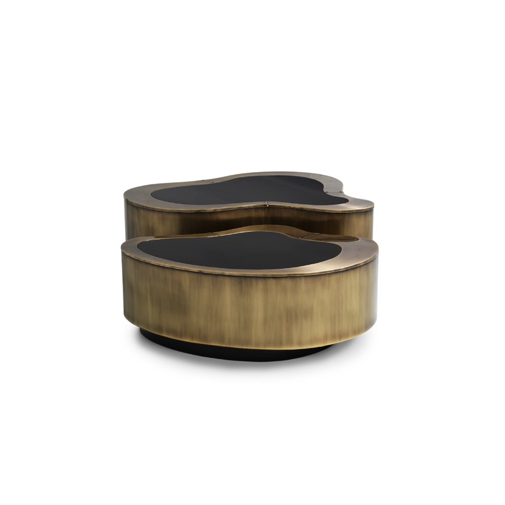 Table made in wood finished with manually hammered patina brass, with a curvilinear top made from walnut veneer. The base is lacquered in black finished with a high gloss varnish.