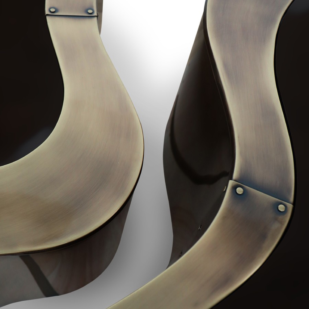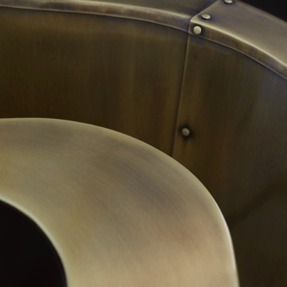 Hammered patina brass, Wood.