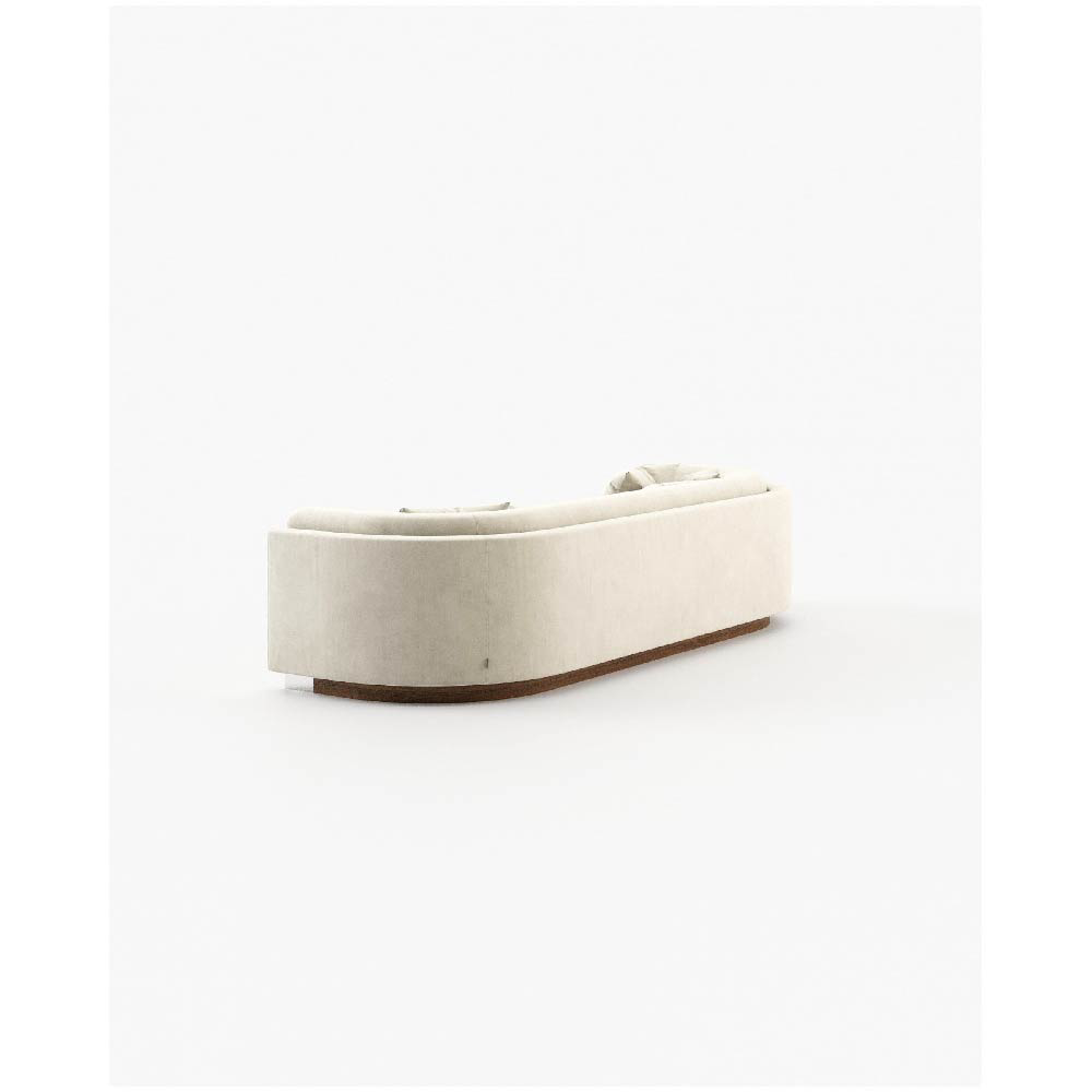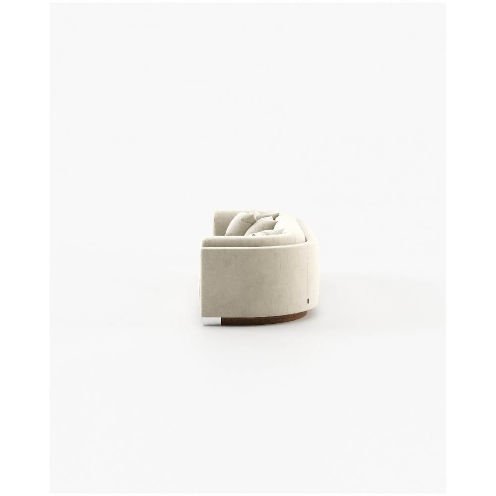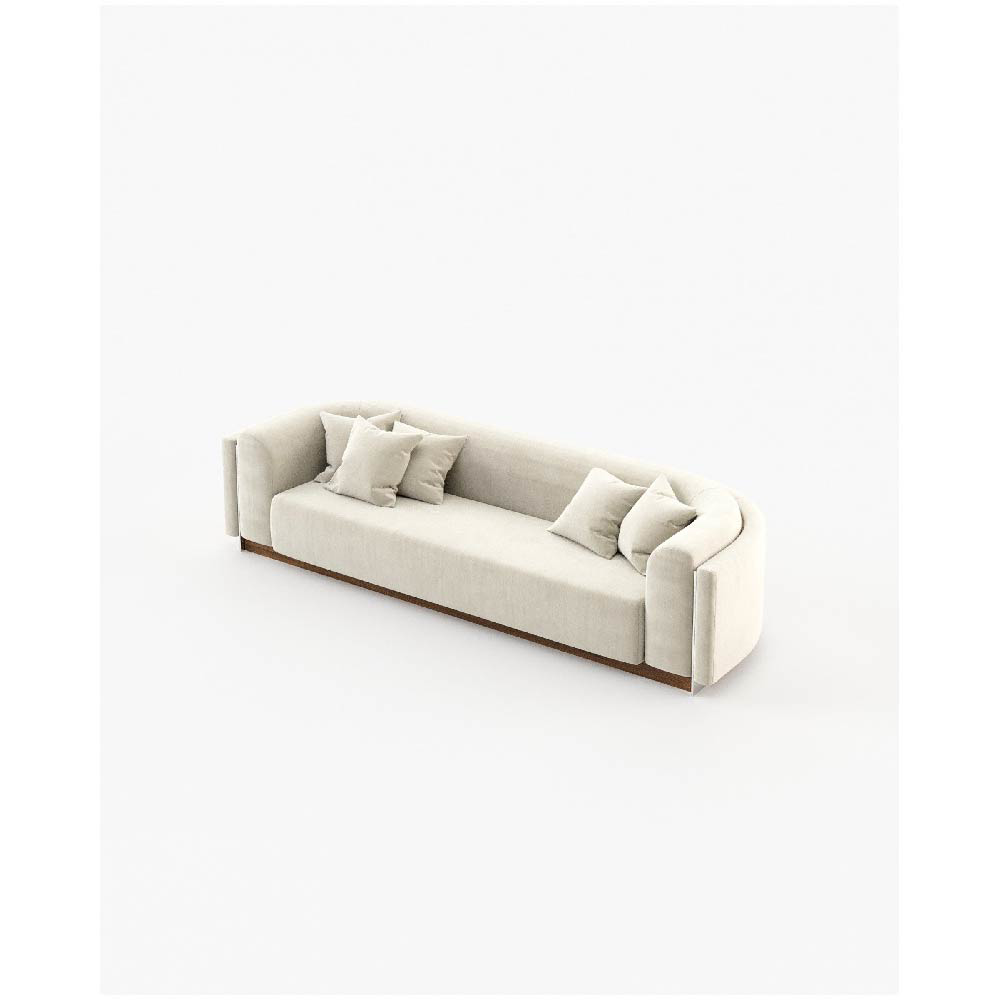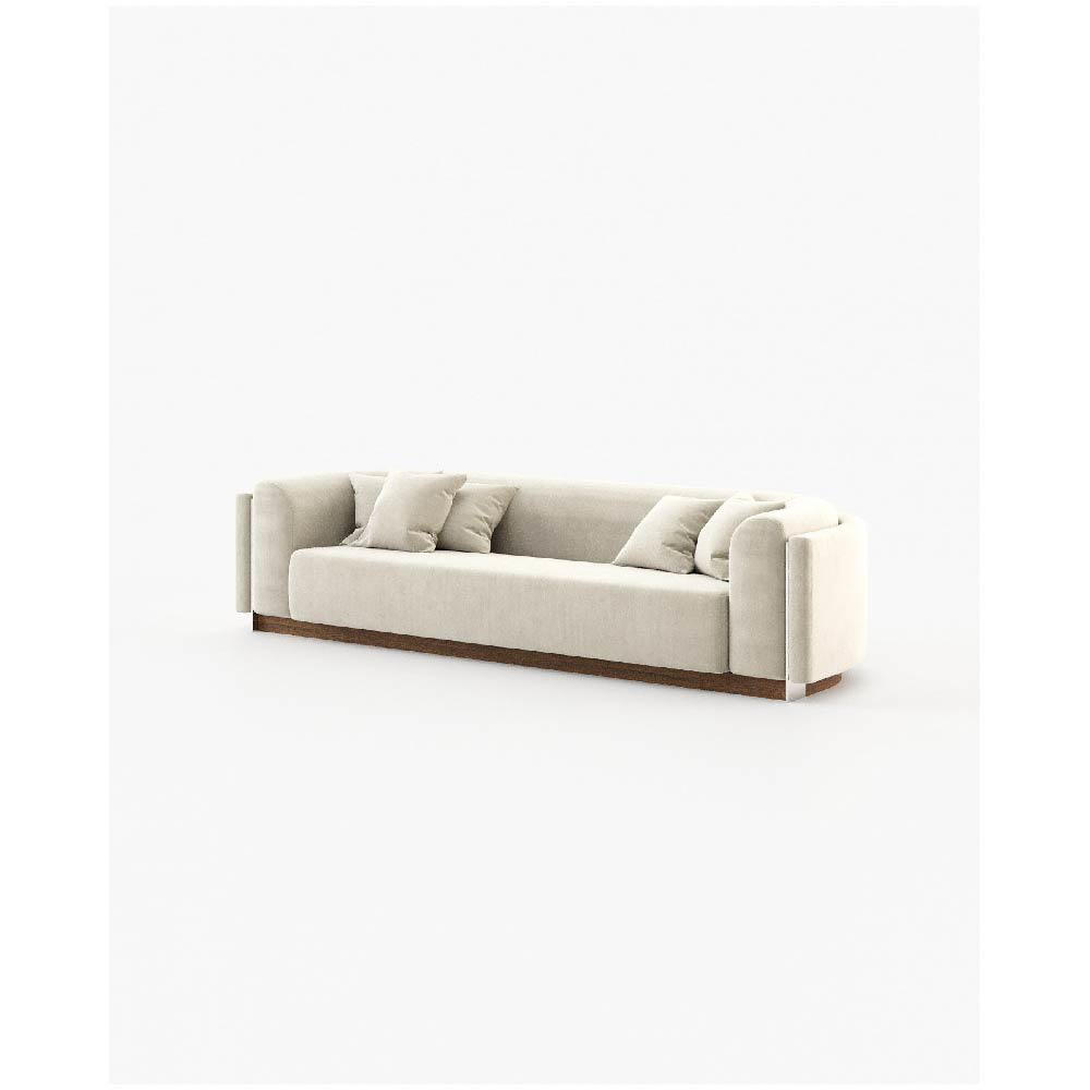 The Wellington sofa is a contemporary piece with a vintage touch, featuring a wooden base and convex edges for a comfortable and stylish addition to any open living space.