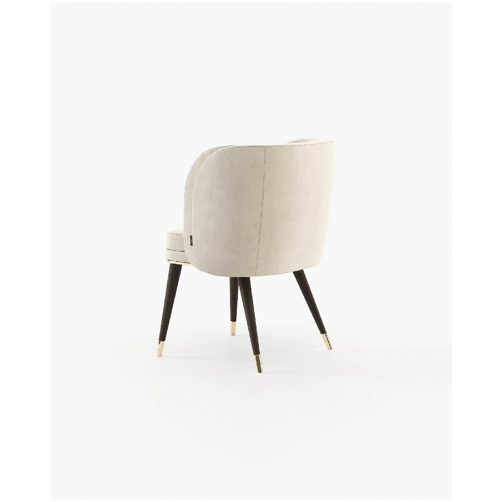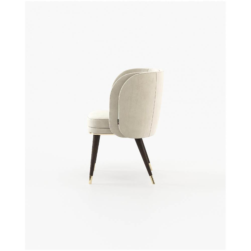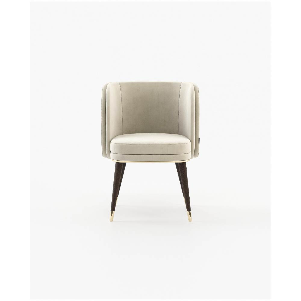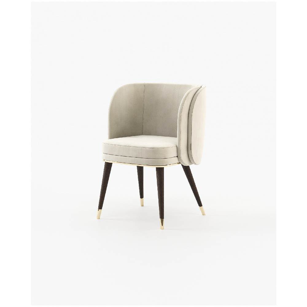 The Ambrose chair features a sleek convex back and a wooden base that supports a majestic upholstered structure with a comfortable seat.
