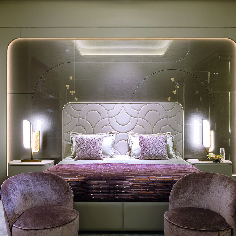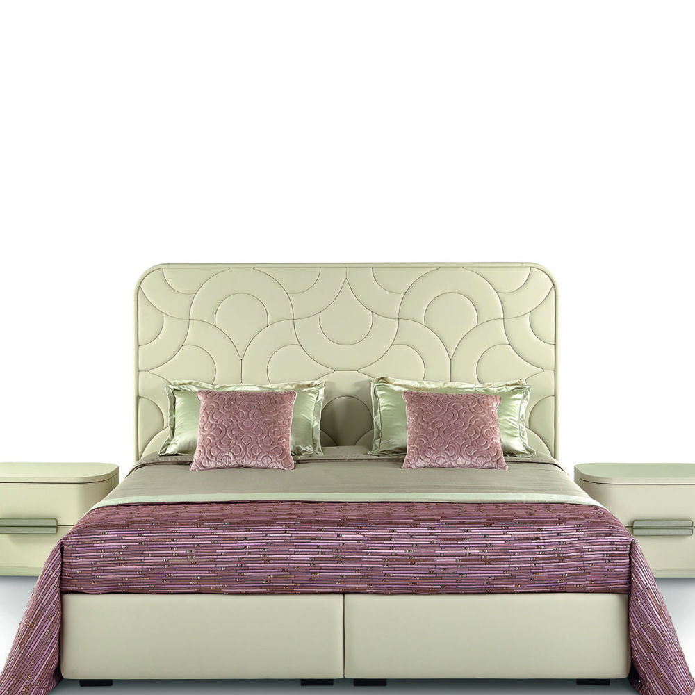 A romantic bed characterized by sweet and rounded lines both in the structure and in the quilted design of the headboard, that can be covered in leather and fabrics from the Tessere collection.